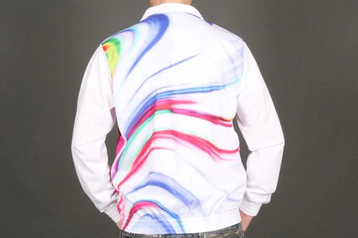 Track jacket in white with rainbow design/,pattern. Men's, white, small.