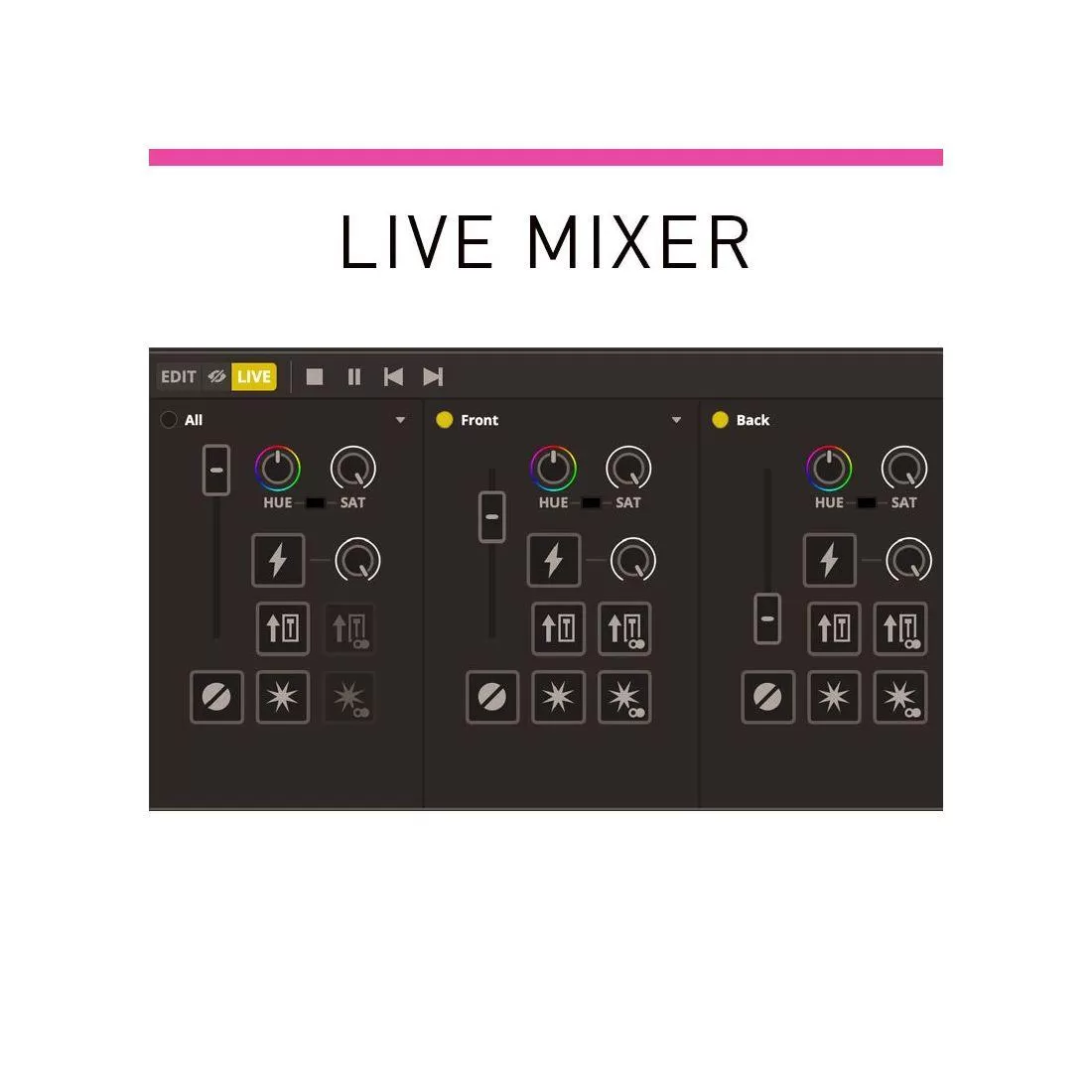 - Live Mixer: Control the dimmers of each group directly in the new Live mixer rack. Trigger the strobe, a blinder, change the colour... also from the Live mixer.