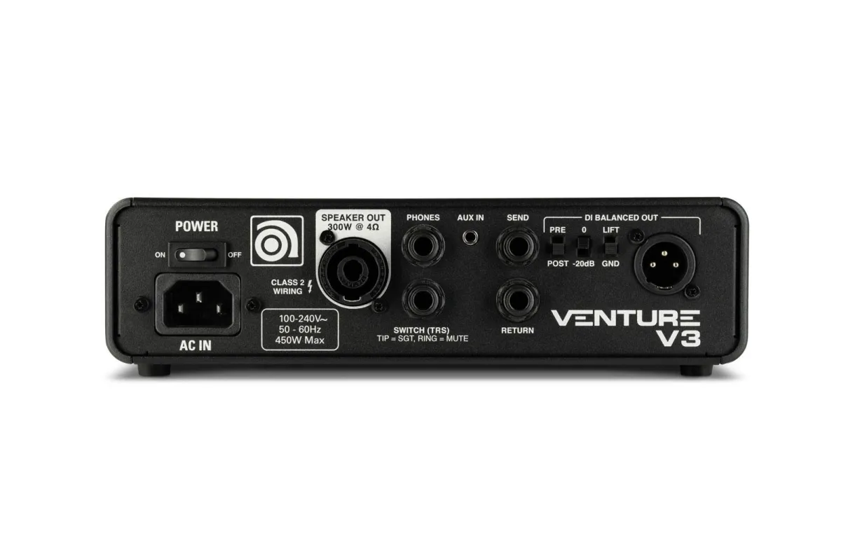 The ultra-portable 300-watt Venture V3 is the smallest and lightest of the three heads in the Venture Series and easily fits into a gig bag, a laptop bag, or the optional Venture carrying bag, making it an excellent choice for the travelling bassist. Its Class D power section provides more than enough power to drive any of the Venture Series speaker cabs or practically any other cab bassists may encounter while touring.