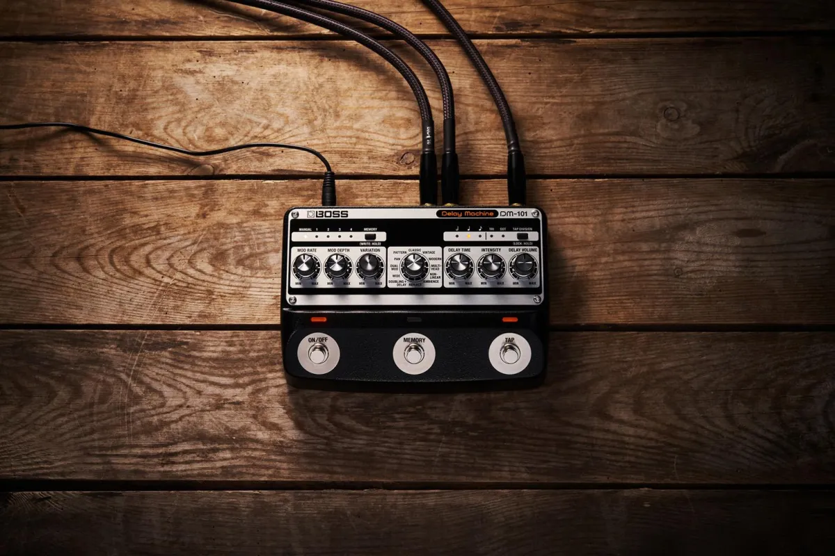 Vintage—Retro analog delay sound inspired by the iconic BOSS DM-2 Delay pedal introduced in 1981. Adjust the modulation behavior by cycling through triangle, sine, and more complex waveform shapes with the Variation knob.