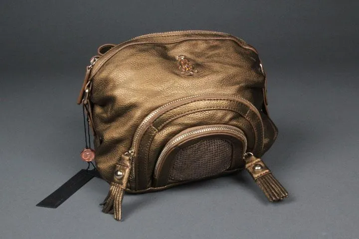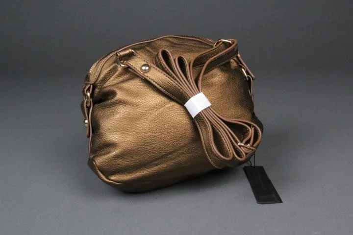 Crossbody bag, Synthetic leather, Adjustable shoulder strap, Two front pockets with zippers, Sequined detailing on the front pocket, Open pocket and cellphone slot inside, Pocket with zipper inside, 27x20x7, bronze.
