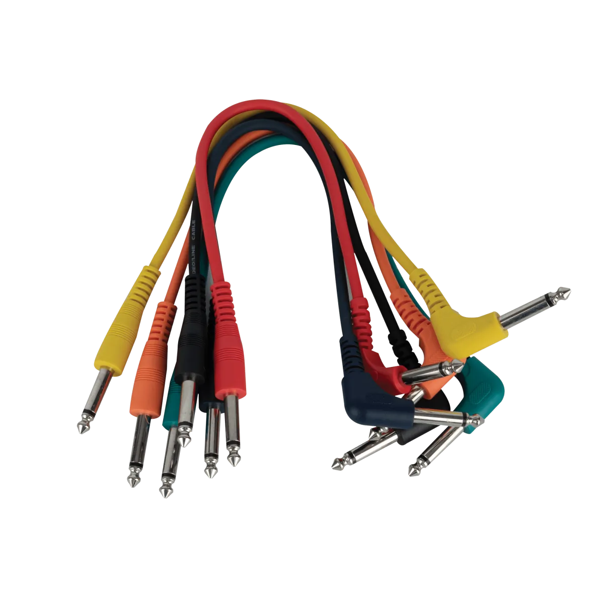Patch cable, 6 coloured 6.3 mm male mono TS straight to 6.3 mm male mono TS angled, unbalanced, 30 cm.