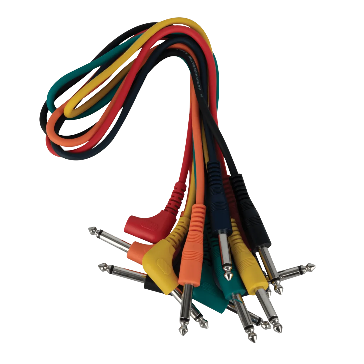 Patch cable, 6 coloured 6.3 mm male mono TS straight to 6.3 mm male mono TS angled, unbalanced, 90 cm.