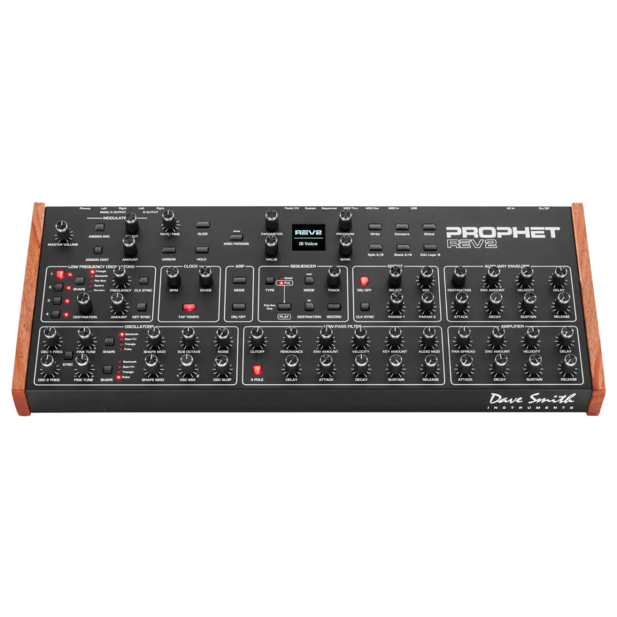 The knob-per-function front panel offers instant access to Prophet Rev2 functions. Included are 512 permanent factory programs and 512 rewritable user programs.