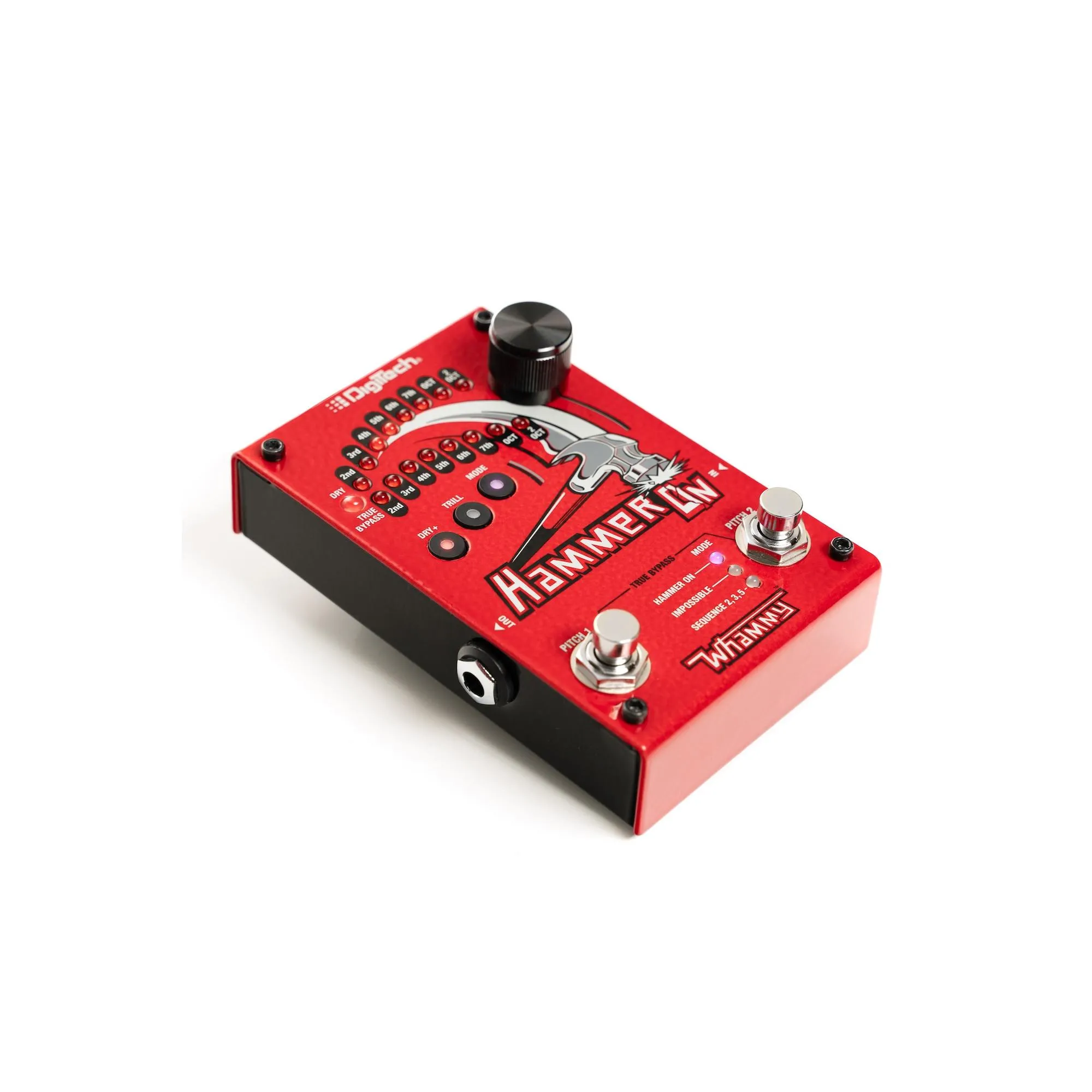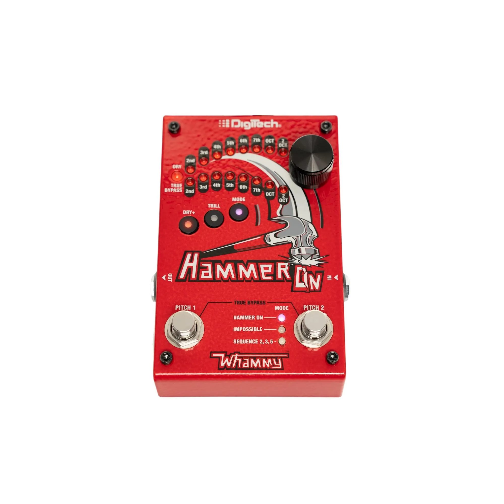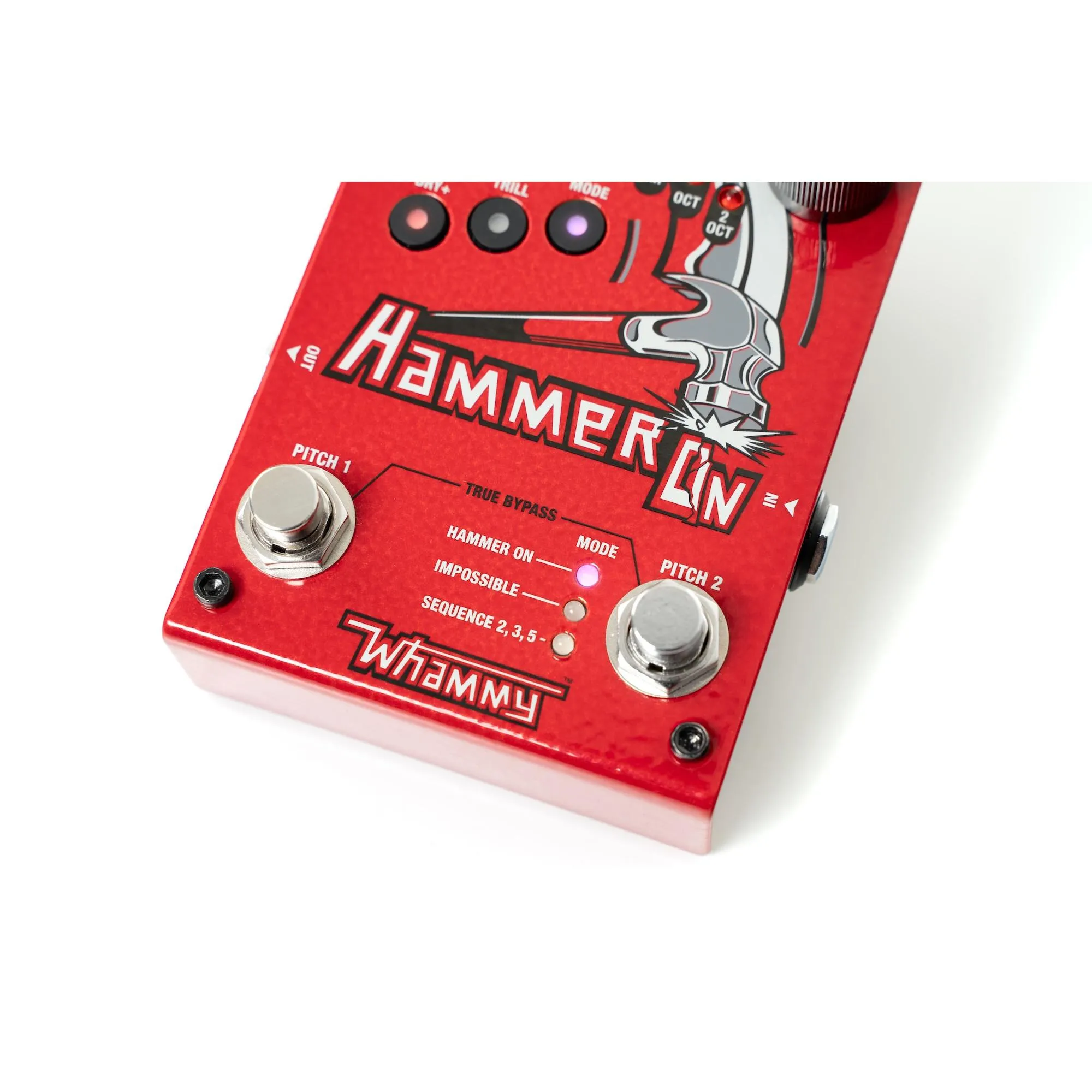 The PITCH 1 footswitch is dedicated to always be a hammer-on selectable momentary pitch shift above or below what you are playing. PITCH 2 footswitch has 3 different modes of operation selectable using the MODE button. There is a button called DRY+ that can turn on the dry signal and a button called TRILL that can mimic rapid presses of the footswitches.