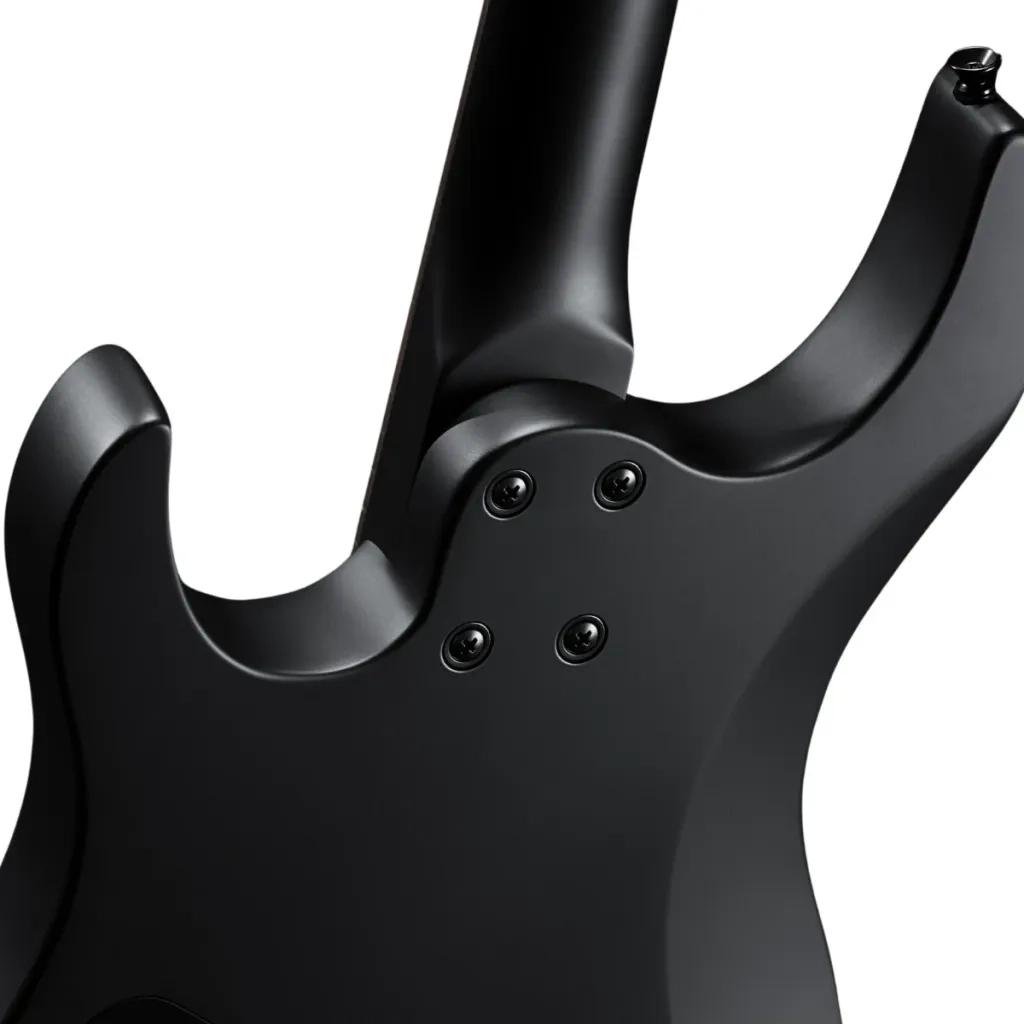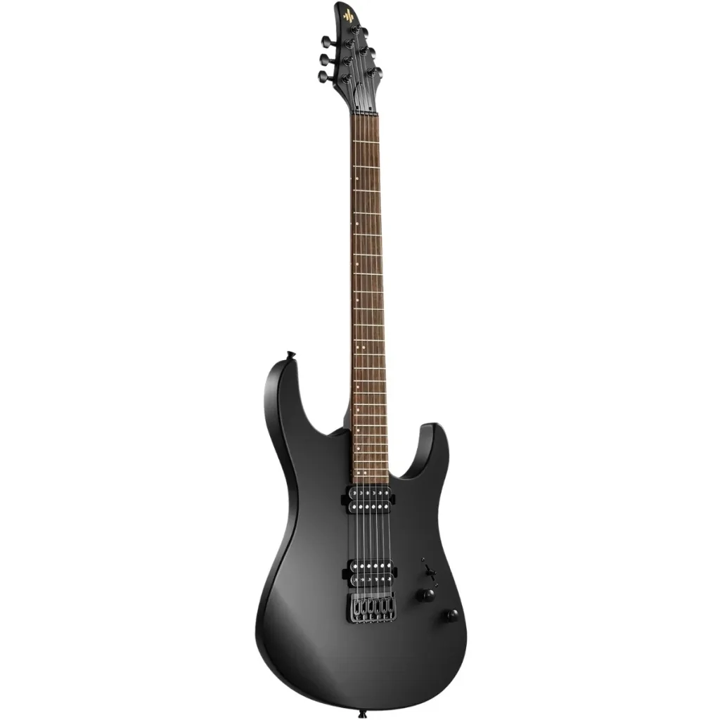 The body is made of poplar, giving it a balanced and resonant sound. The matte black finish and matching headstock give it a distinctive and stylish look. The neck is bolt-on with a plywood fingerboard, and the black satin finish on the neck provides good grip and comfort.
