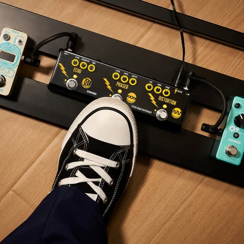 Donner and Third Man Hardware have teamed up to create an analog multi-effect that combines three of Jack White's (White Stripes, etc.) favorite effects in a single pedal format. Triple Threat combines classic Echo, Phaser, and Distortion in a versatile and compact unit – perfect for practice, studio, and stage.