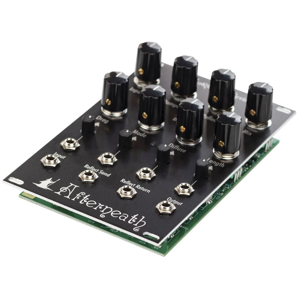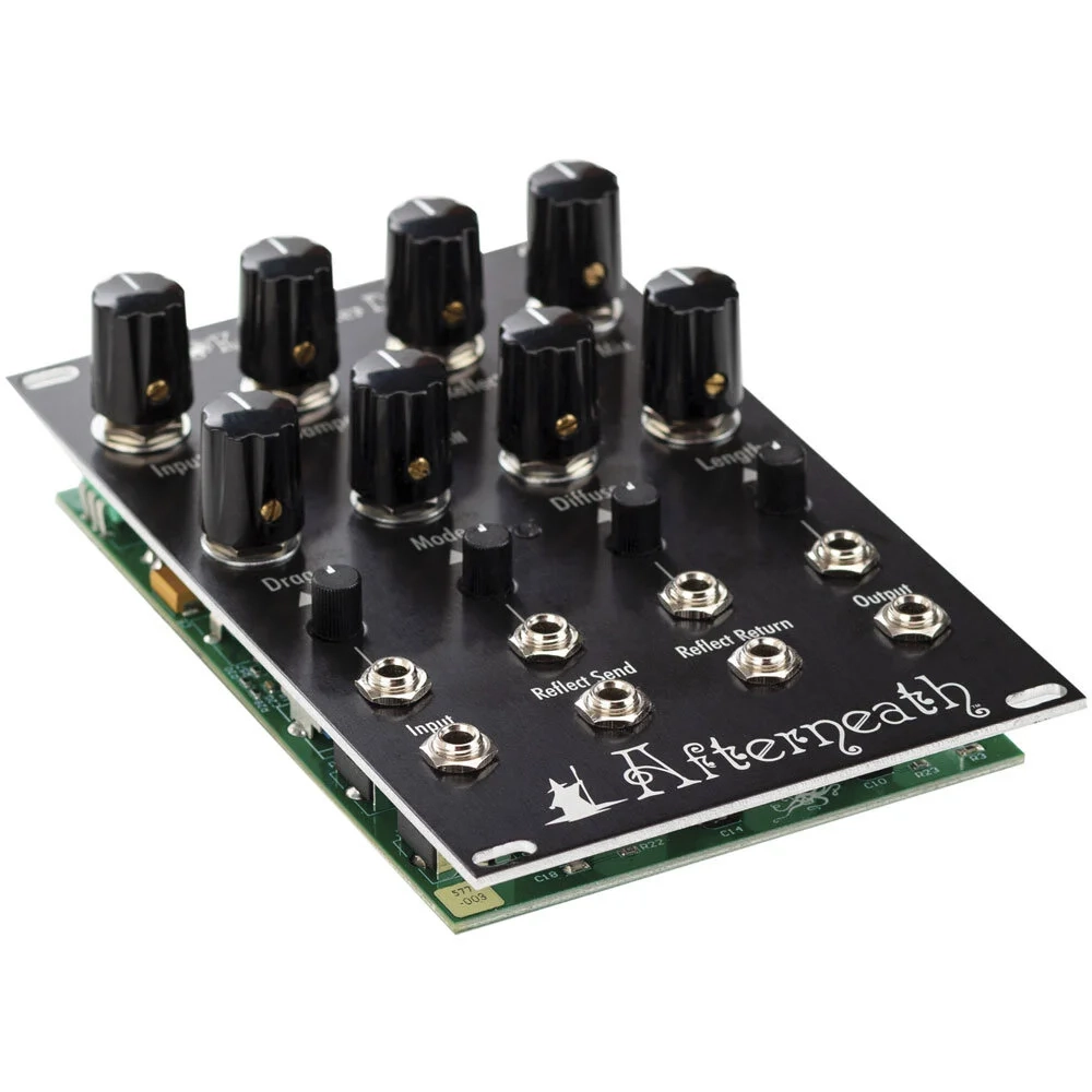 The Afterneath Eurorack Module brings the Otherworldly sounds from the effects pedal world right into your modular synthesizer with an expanded feature set. The Afterneath module features one main audio input, one main audio output, an audio send and return for the Reflect feedback path, and nine controls. Four of the parameters are controllable via CV, and each has been equipped with a dedicated attenuverter to process the incoming CV. The Afterneath module has a completely analog dry signal path and a totally digital wet signal path.
