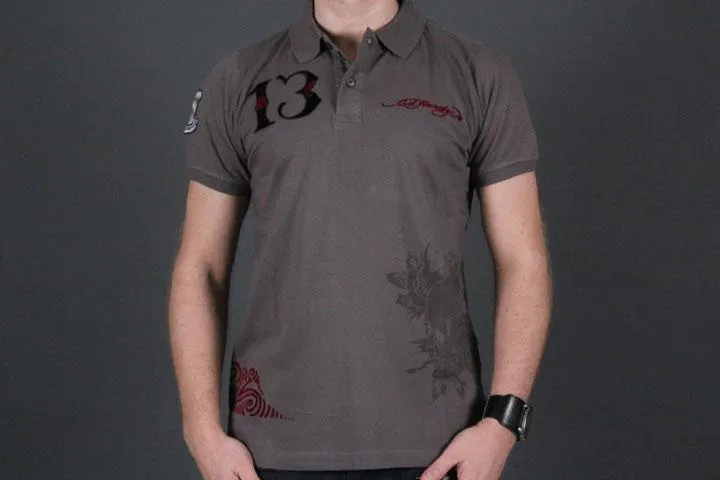 Polo piqué from Ed Hardy with cool Lucky D 13 print. 100% cotton. Men's, gray, XL.