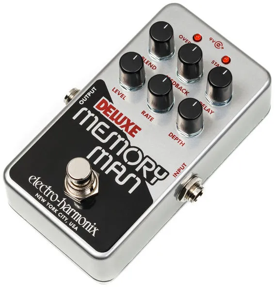 Electro Harmonix Nano Deluxe Memory Man; Effects Pedal for Electric Guitar; this fully analog pedal delivers the lush delay, chorus and vibrato of the large-format Deluxe Memory Man in a compact chassis; additional Rate knob for enhanced modulation control; internal Tails Switch sets whether the echoes decay naturally when the pedal is switched to bypass or if they are instantly muted; Controls: Blend, Feedback, Delay, Level, Rate, Depth; Push Buttons: ; LED: Effect On; Display: ; Footswitches: Effect Bypass; Connections: Input (1/4" Jack), Output (1/4" Jack); Power Supply connector: Barrel Connector 5.5 x 2.1 mm, center negative; Current Draw: 150 mA; powered by a 9 V DC Power Supply (included); True Bypass; Dimensions (W x D x H): 70 x 114 x 53 mm (2,75" x 4,5" x 2,1"); Weight: 635 g (1,4 lbs); Note: Battery operation is not supported