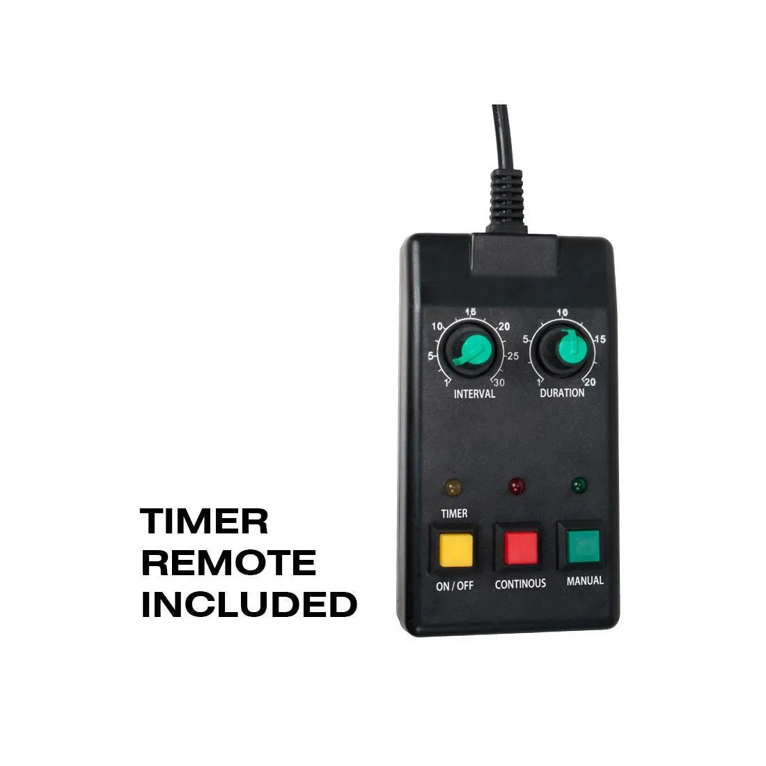 • Includes ADJ VFTR13 12-foot wired remote with On/Off, continuous and manual buttons, plus interval and duration output potentiometers