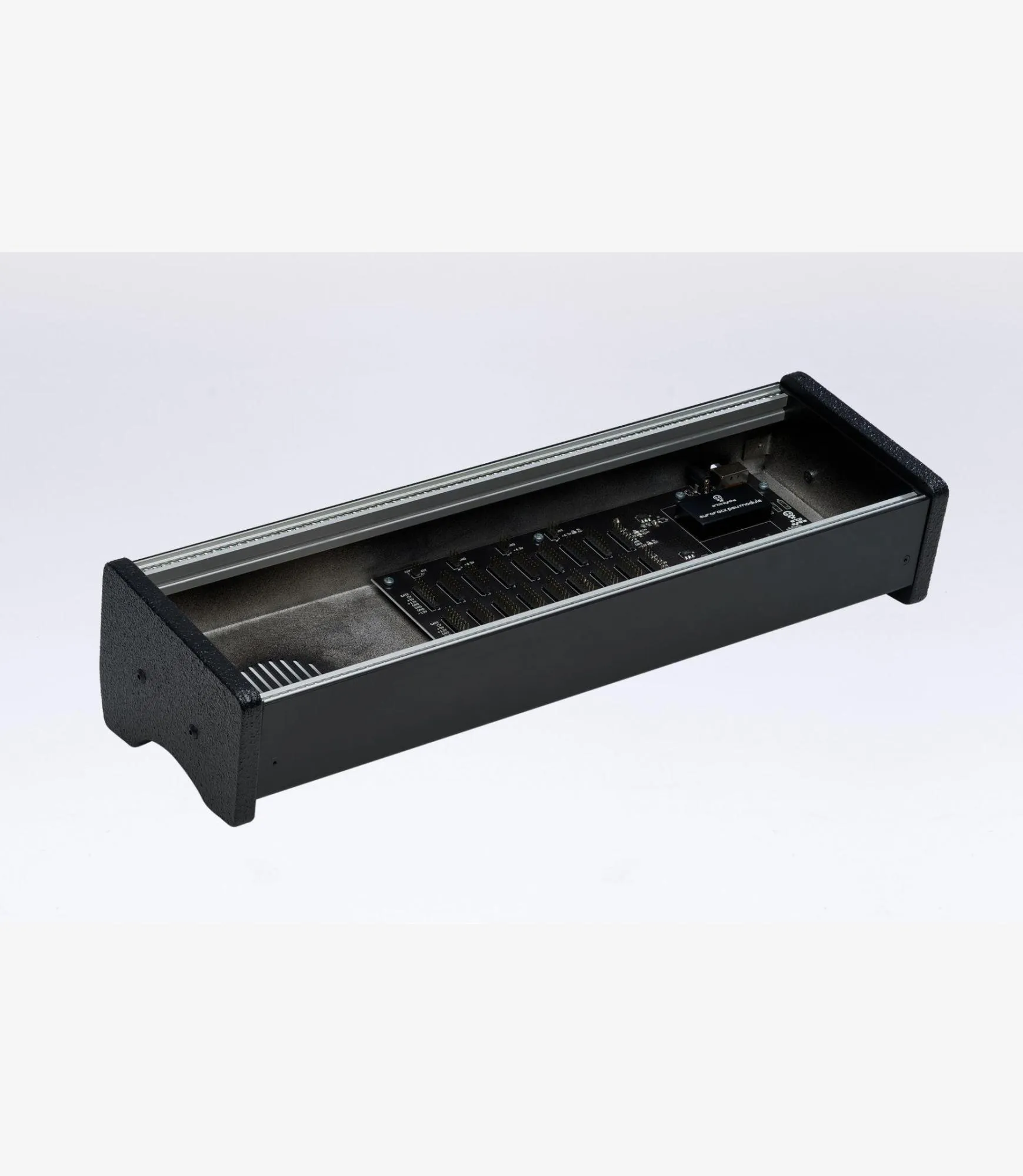 Full aluminium 1x84HP 57mm deep skiff eurorack enclosure with aluminium rails of unique design.