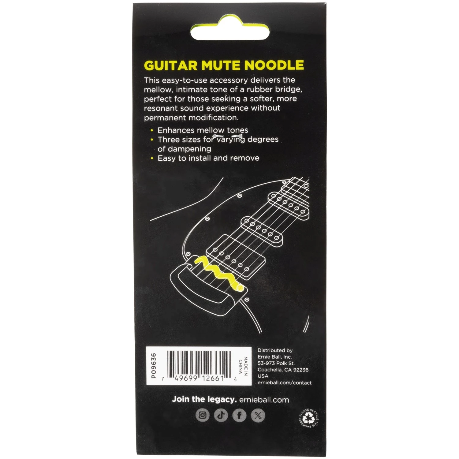 The Ernie Ball Mute Noodle Guitar is designed to be placed between the strings to create a warmer, more muted sound similar to vintage guitars with rubber mutes. A perfect solution when you want that “muddy” muted vintage sound without having to modify your instrument.