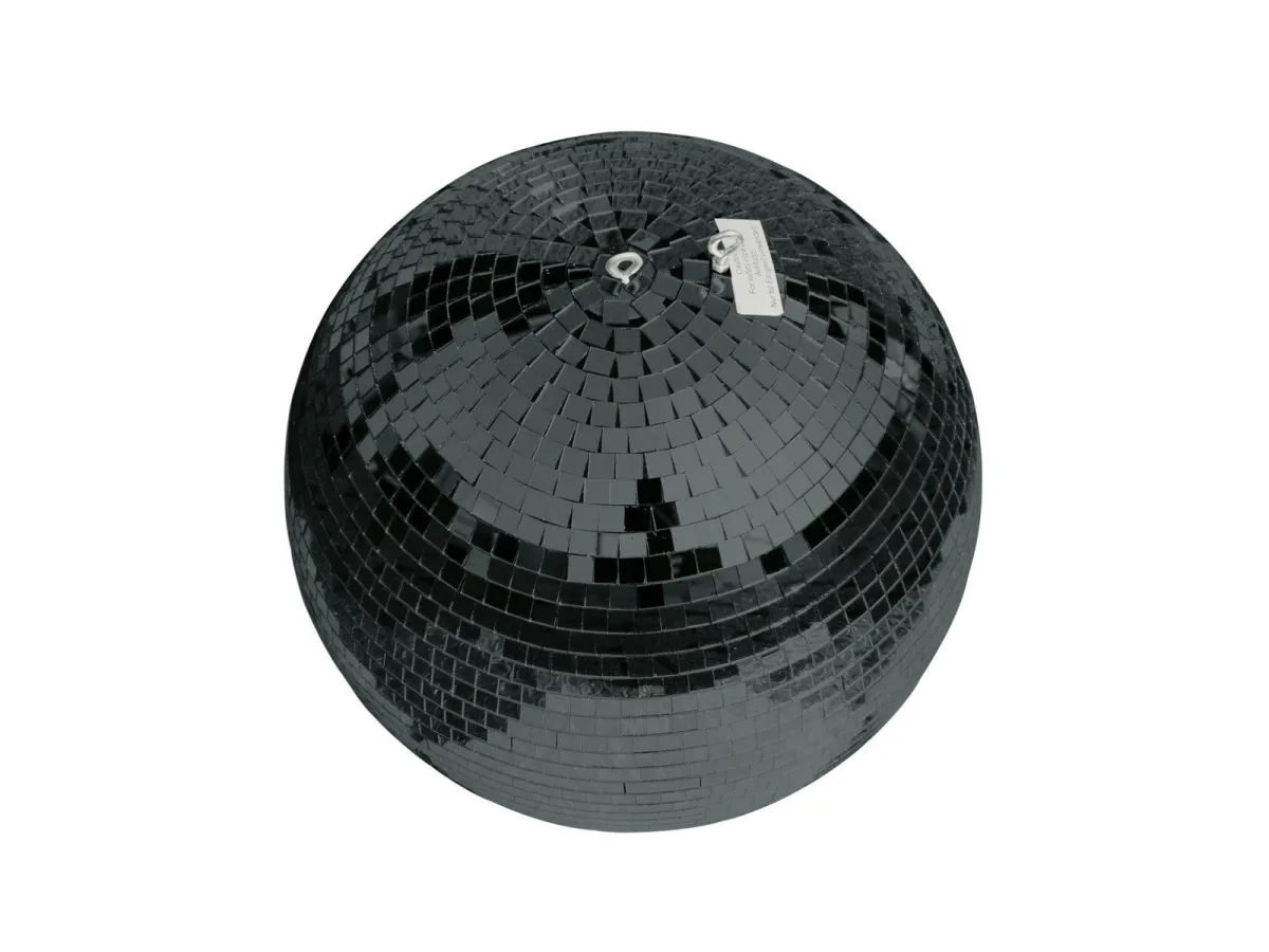 This model in professional quality has a diameter of 40 cm and is covered with countless small black mirrors (10 x 10 mm). The robust plastic core is covered with hundreds of small mirror facets and features a continuous shaft guaranteeing a high tensile strength. The mirror ball also includes two eyelets allowing for attaching both the fastening chain and the required fall protection.