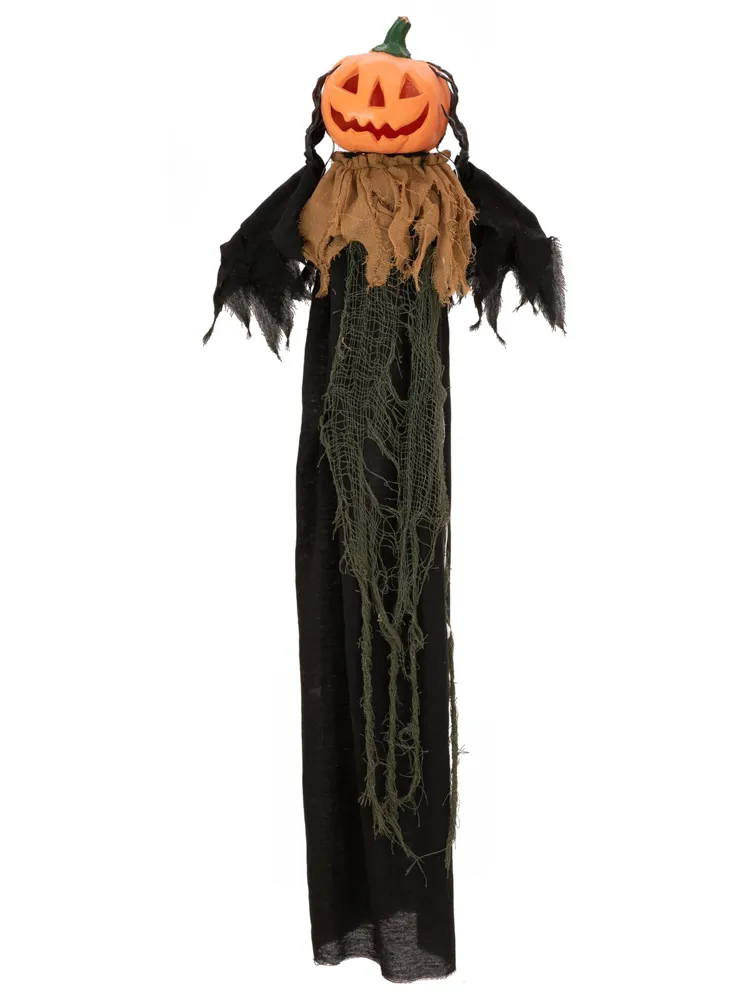 With a loud voice and laughter, the decorative figure welcomes your guests, while the inside of the hollowed pumpkin head glows statically in red. At the same time, the head raises and lowers via a built-in mechanism.