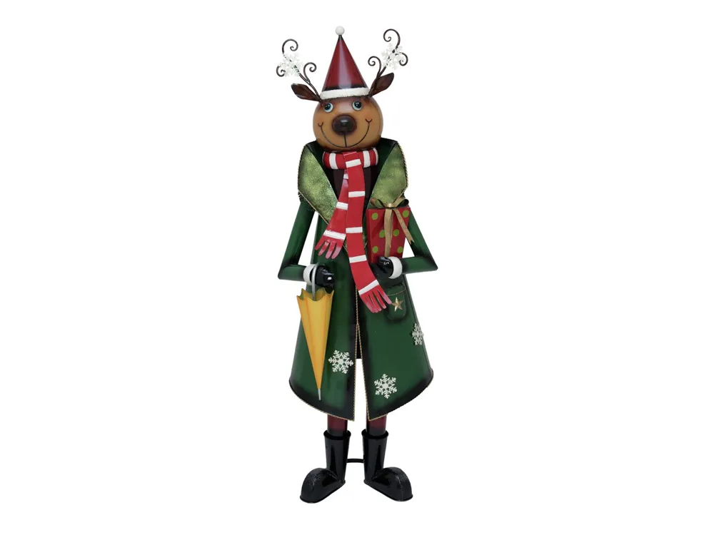 Reindeer holding a gift in his left and an umbrella in his right hand