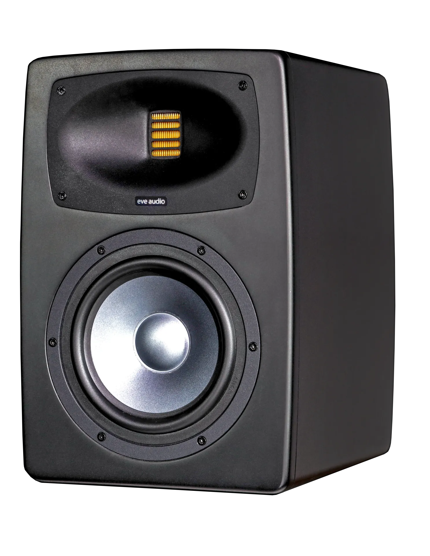 The front-facing, multi-color "eve audio" logo provides instant visual feedback on system status, indicates clipping, shows firmware update progress, and other operational states