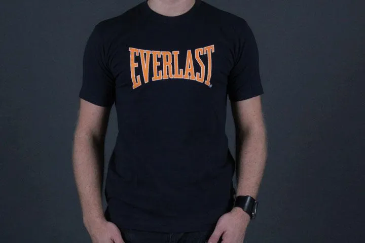 Navy blue t-shirt with orange logo (white outline) printed on the chest. 100% cotton. Men's, navy blue, large.