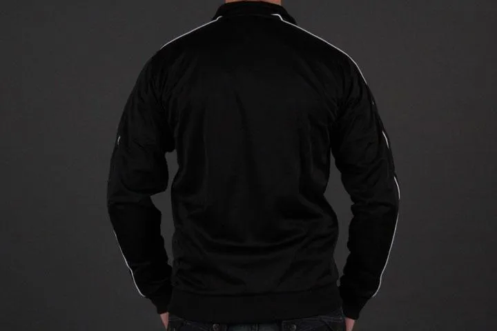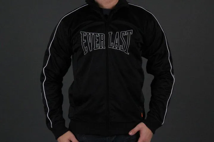 Black zip up with Everlast logo printed on the chest. White stripes along the shoulders/sleeves. 100% polyester. men, black, medium.