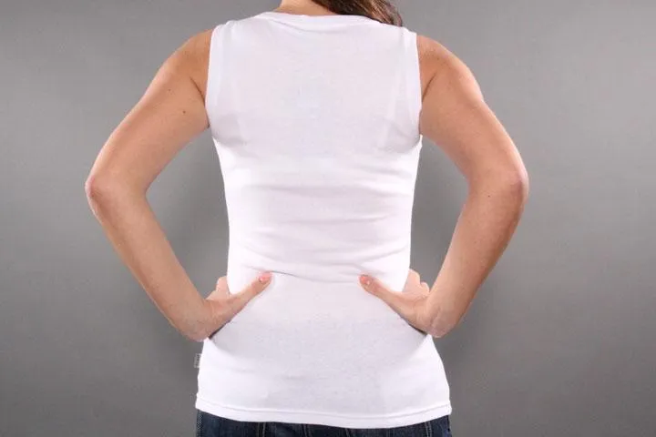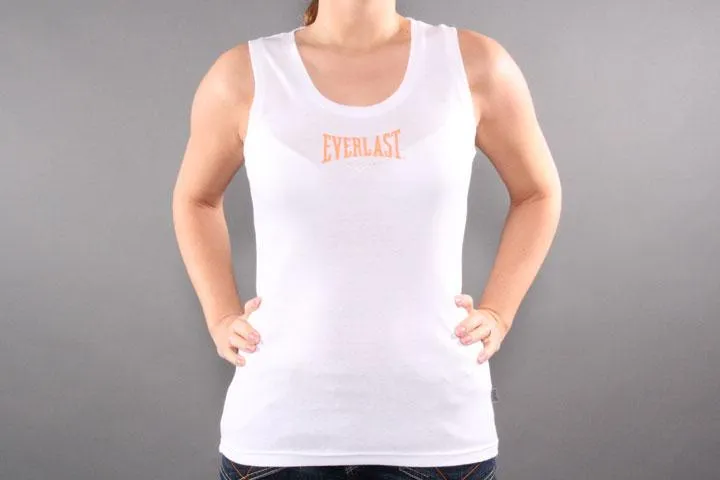 White sleeveless t-shirt with orange/grey logo. 100% cotton. Ladies, white, medium.