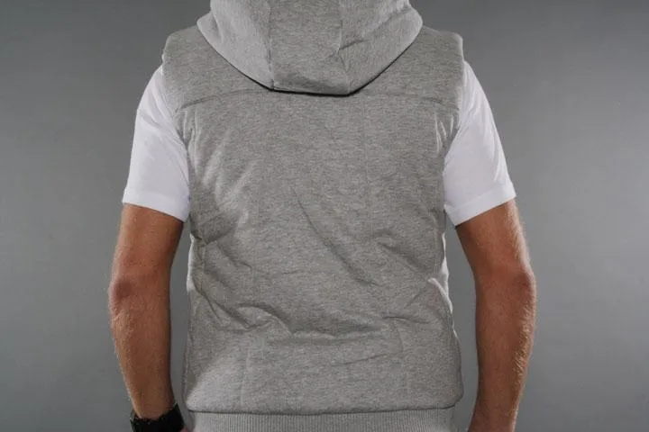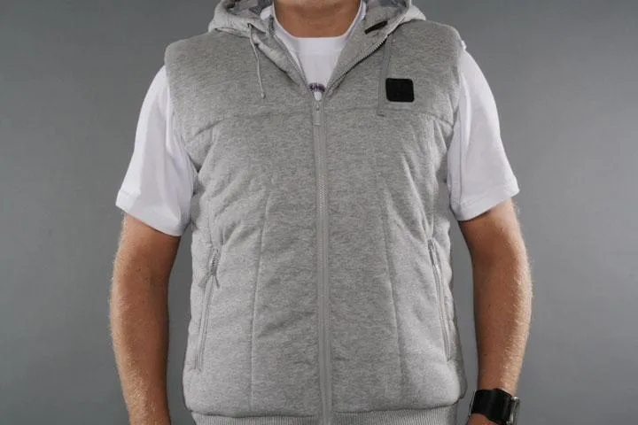 Grey lined vest with hood and zip. Outer fabric: 100% cotton, lining: 100% polyester. Men's, grey, large.