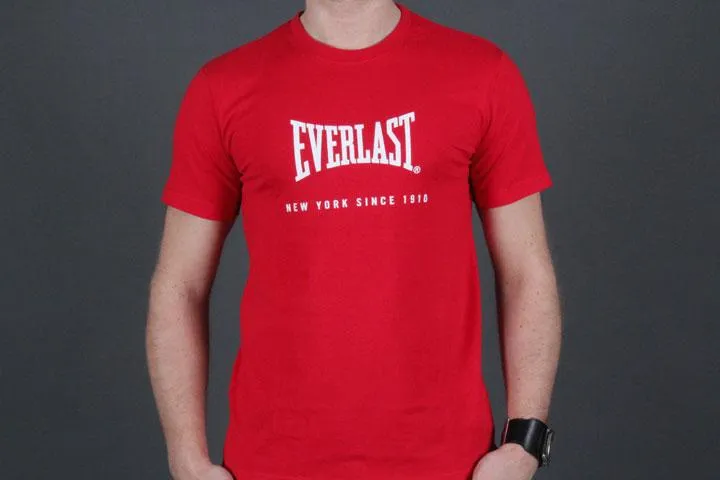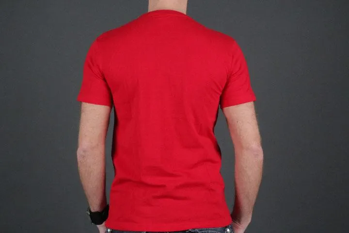Red t-shirt with white print on the chest. 100% cotton. Men's, red, medium.