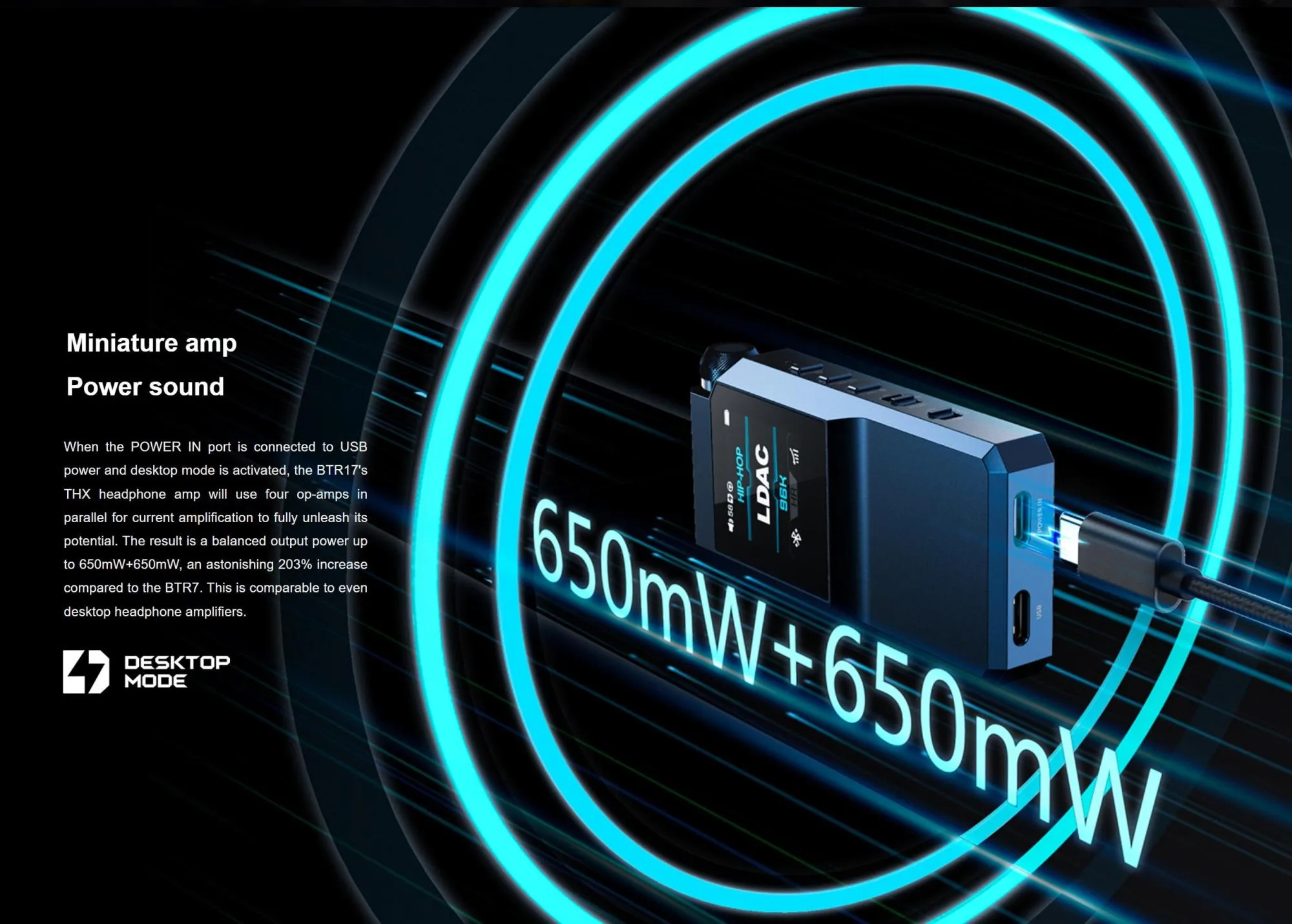 When USB power is applied to the POWER IN port and desktop mode is enabled, the BTR17's THX headphone amplifier utilises four operational amplifiers connected in parallel to amplify the power to its full potential. The result is a balanced output power of up to 650mW+650mW, an astonishing increase of 203% compared to the BTR7. This is comparable even with desktop headphone amplifiers.