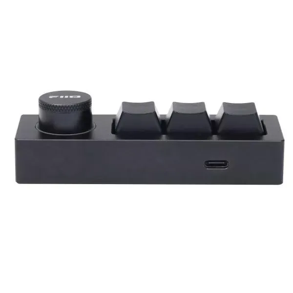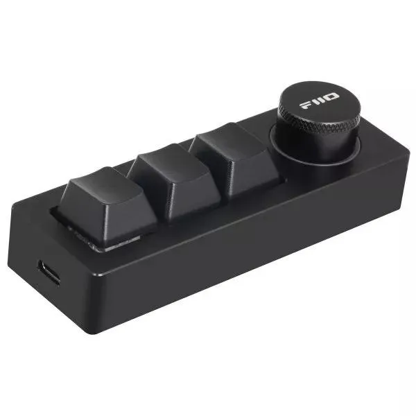 The FiiO KB1K mechanical keypad is actually a multimedia control keypad. This small compact keypad is programmed with multimedia functions such as play/pause, and volume adjustment (with the knob). It allows for play/pause, fast-forward, and other media controls with the connected source device.
