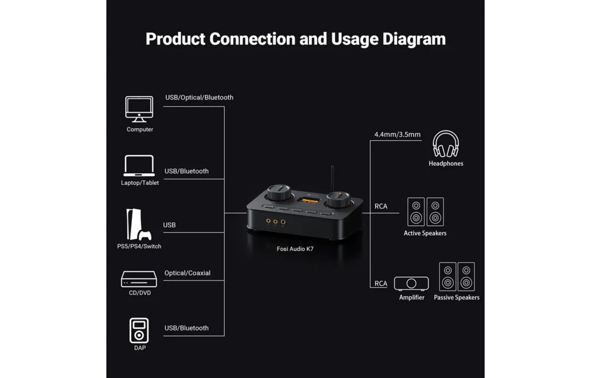 The Fosi Audio K7 is a high-performance desktop DAC and headphone amplifier designed for demanding listeners. Combining advanced digital conversion with a powerful amplification stage, it delivers clean, detailed audio suitable for both critical listening and everyday use.