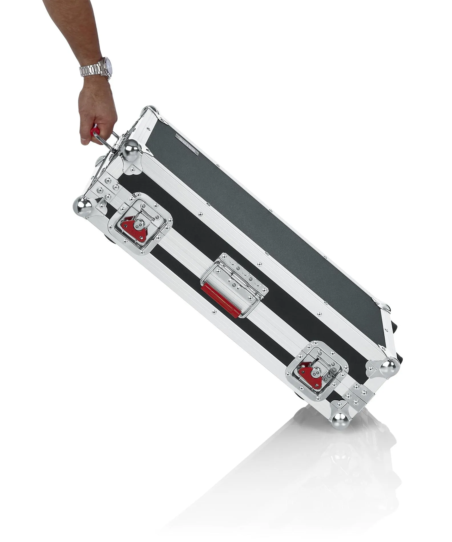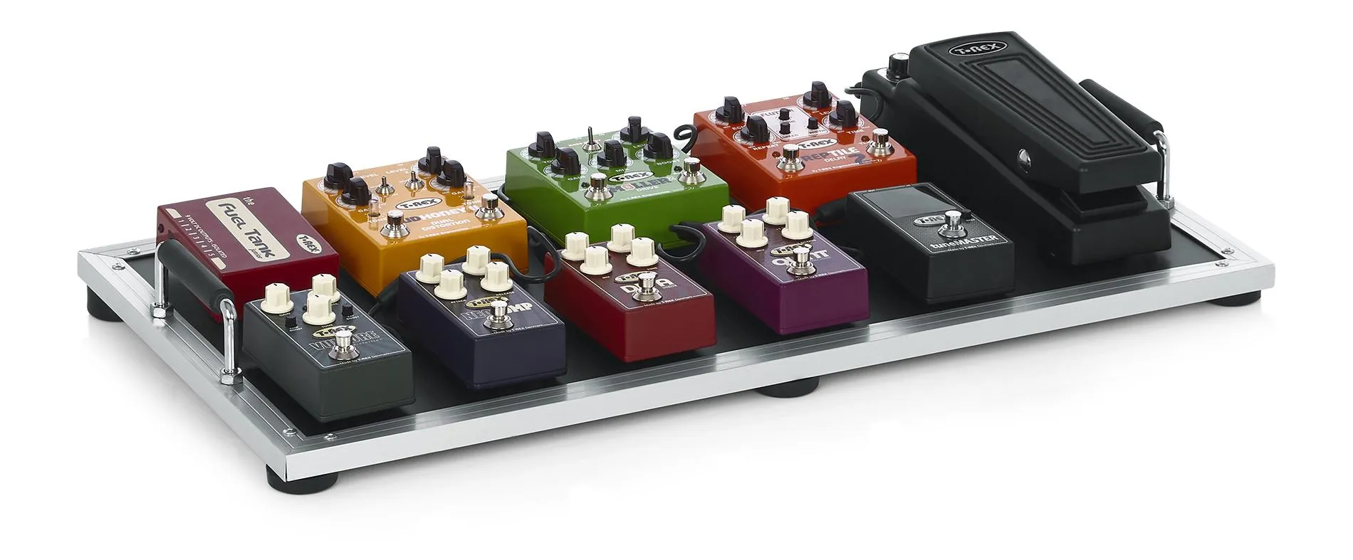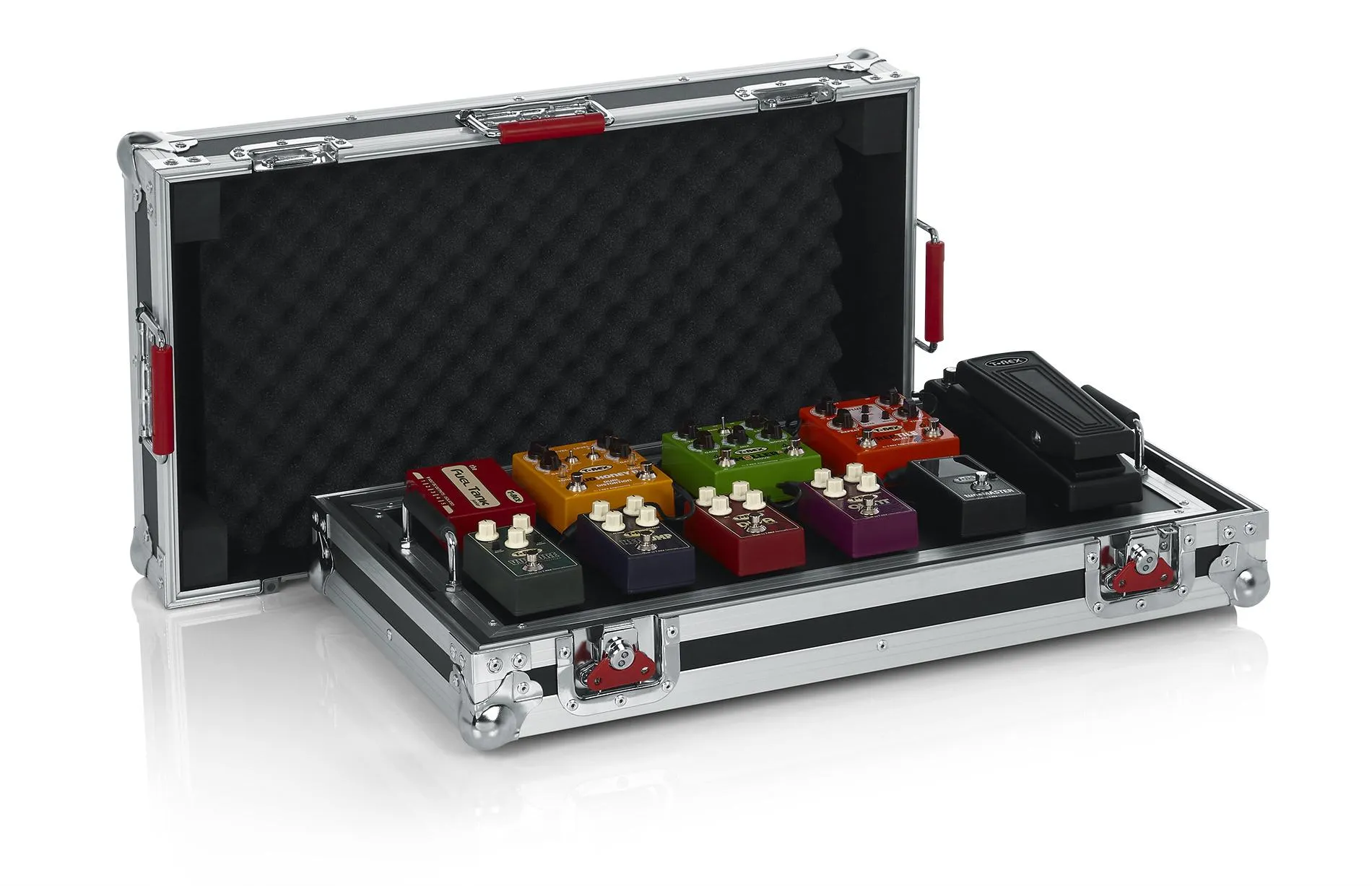 Large tour grade pedal board and flight case for 10-14 pedals. Removable 24″x11″ pedal board surface and inline wheels