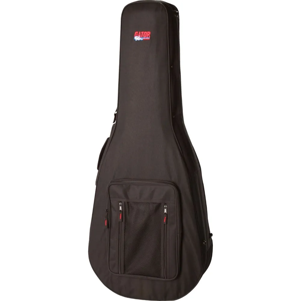 Low weight and flexibility combined with protective foam make the Gator Guitar Case a perfect blend of a hardshell case and gig bag. Durable nylon covering over dense EPS foam with sturdy neck support keep your dreadnought guitar safe and won't bang your shins. The plush interior helps prevent scratches. 2 accessory pockets outside the Gator GL-Dread-12 case keeps your guitar accessories handy. Get your guitar where you need to go with the included nylon-web handle or removable, padded carrying strap. fits 6- and 12-string dreadnought guitars.
