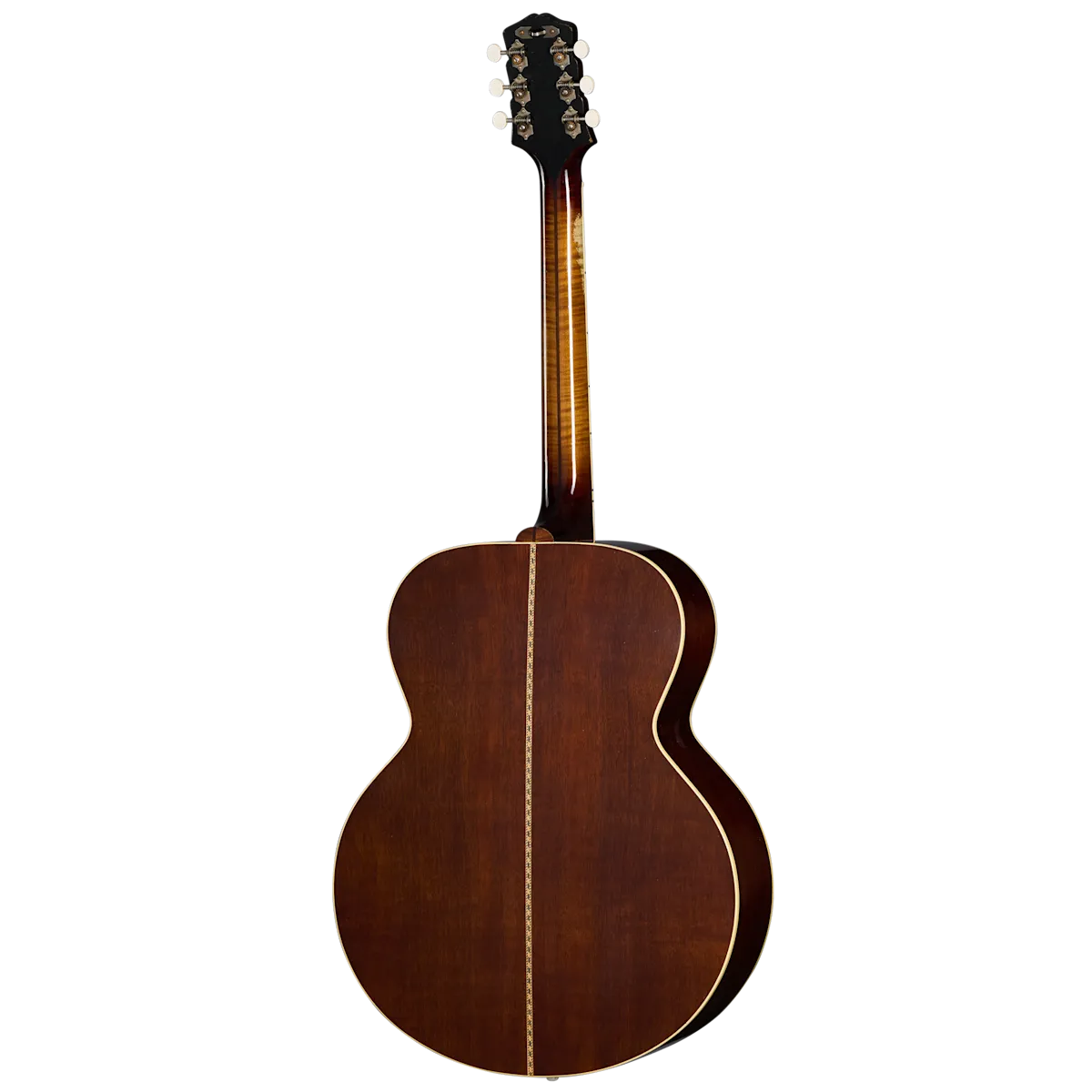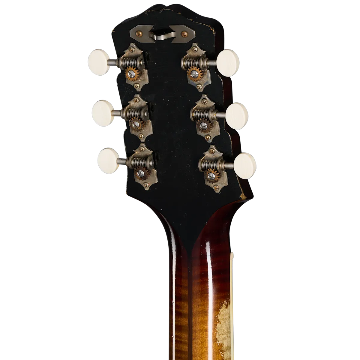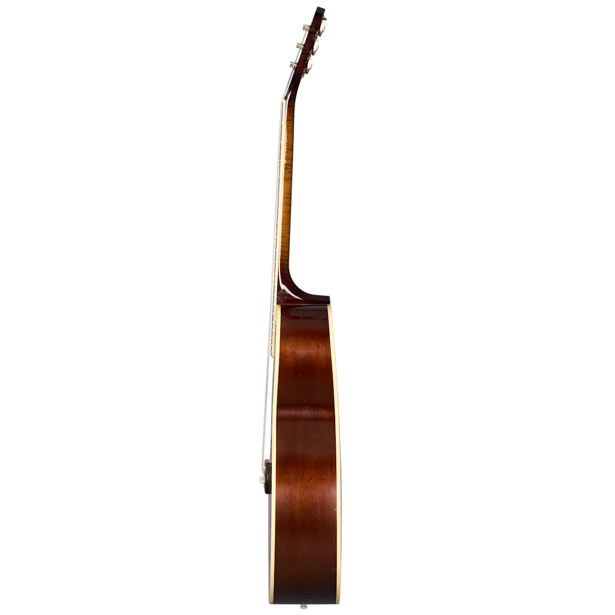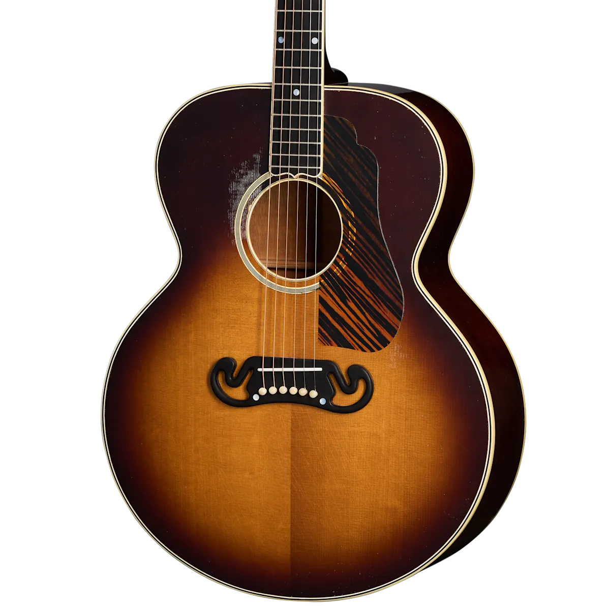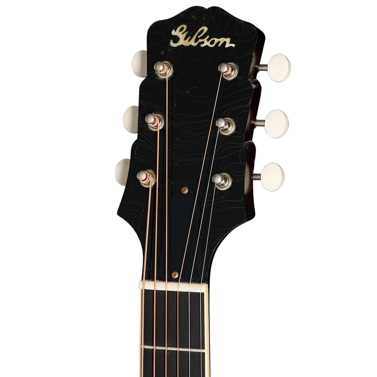 The 1939 SJ-100 is a replica of the rare and very distinctive mahogany-backed Super Jumbo 100 that was built for only a few years (circa 1939-1942). The 1939 SJ-100 Heavy Aged fully replicates the original and exceptionally rare 1939 SJ-100 guitars that are coveted by collectors and vintage Gibson experts around the world. It features a thermally aged red spruce top with Gibson’s hand-scalloped X bracing that helps give it the tone of a long-cherished heirloom, solid mahogany back and sides, and the top and back are both bound. The 2-piece maple neck has a rounded profile, 25.5” (647.7 mm) scale length, and a bound ebony fretboard with 20 standard frets, mother-of-pearl dot inlays, and an easy-playing 12” fretboard radius. The neck features Gibson’s compound dovetail neck-to-body joint and is set using hot hide glue. Other notable features include a vintage SJ-100 style firestripe pickguard, ebony moustache™ bridge, bone bridge pins, nut and saddle, the rare, vintage “stair step” headstock design, the Gibson script style headstock logo inlaid in mother of pearl, and Waverly tuners with ivoroid knobs. Crafted by the expert luthiers and craftspeople at the Gibson Custom Shop in Bozeman, Montana, it has been artfully aged by the artisans of the Murphy Lab to give it the look and feel of a long-cherished musical companion. Here’s your chance to own one of Gibson’s rarest acoustic guitar models, with all the tone, vibe, playability, and appearance of a vintage original without the vintage price tag and potential issues that can accompany an eighty-year-old guitar. A Gibson Custom hardshell case is also included.
