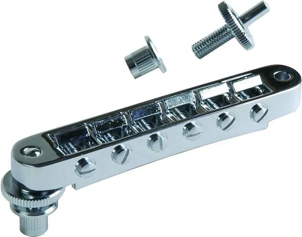 The Gibson Tune-o-matic bridge remains one of the most revered and copied pieces of guitar hardware ever developed, and the Nashville Tune-o-matic bridge offers un-notched saddles with individual saddle screw retainer clips, and a wider footing for increased intonation range. The stud and thumbwheel are also cast directly onto the bridge, allowing the Nashville Tune-o-matic to slide directly into place.