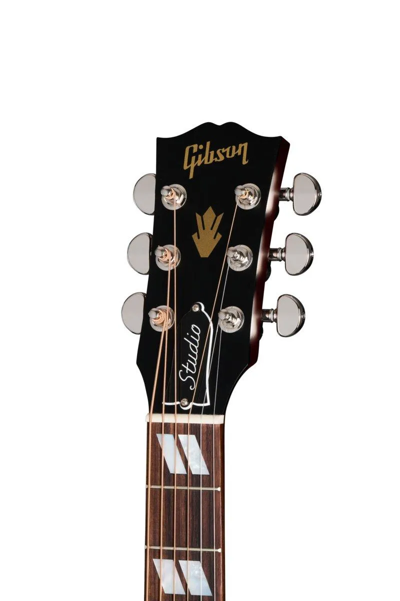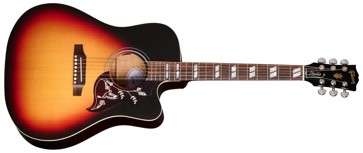 The Hummingbird™ Studio EC continues Gibson's long history of producing world-famous square shoulder body designs and now offers players even more expressive possibilities with a cutaway mahogany body paired with a Sitka spruce top that delivers improved upper fret access. The utile neck features a rosewood fretboard with mother-of-pearl parallelogram inlays, a fast-playing Round a SlimTaper™M profile, and a 16" radius for easy string bending. The TUSQ0 bridge pins, saddle, and nut, along with the Grover® Rotomatic® tuning machines, keep the tuning solid. The pickguard features one-color Hummingbird Studio graphics, and the satin nitrocellulose finish gives the Hummingbird Studio EC the look and feel of a long-treasured musical companion. An L.R. Baggs™ Element Bronze active under-saddle piezo pickup ensures easy studio-quality plug-and-play anywhere, while the included hardshell case helps keep this bird safe wherever your travels take you.