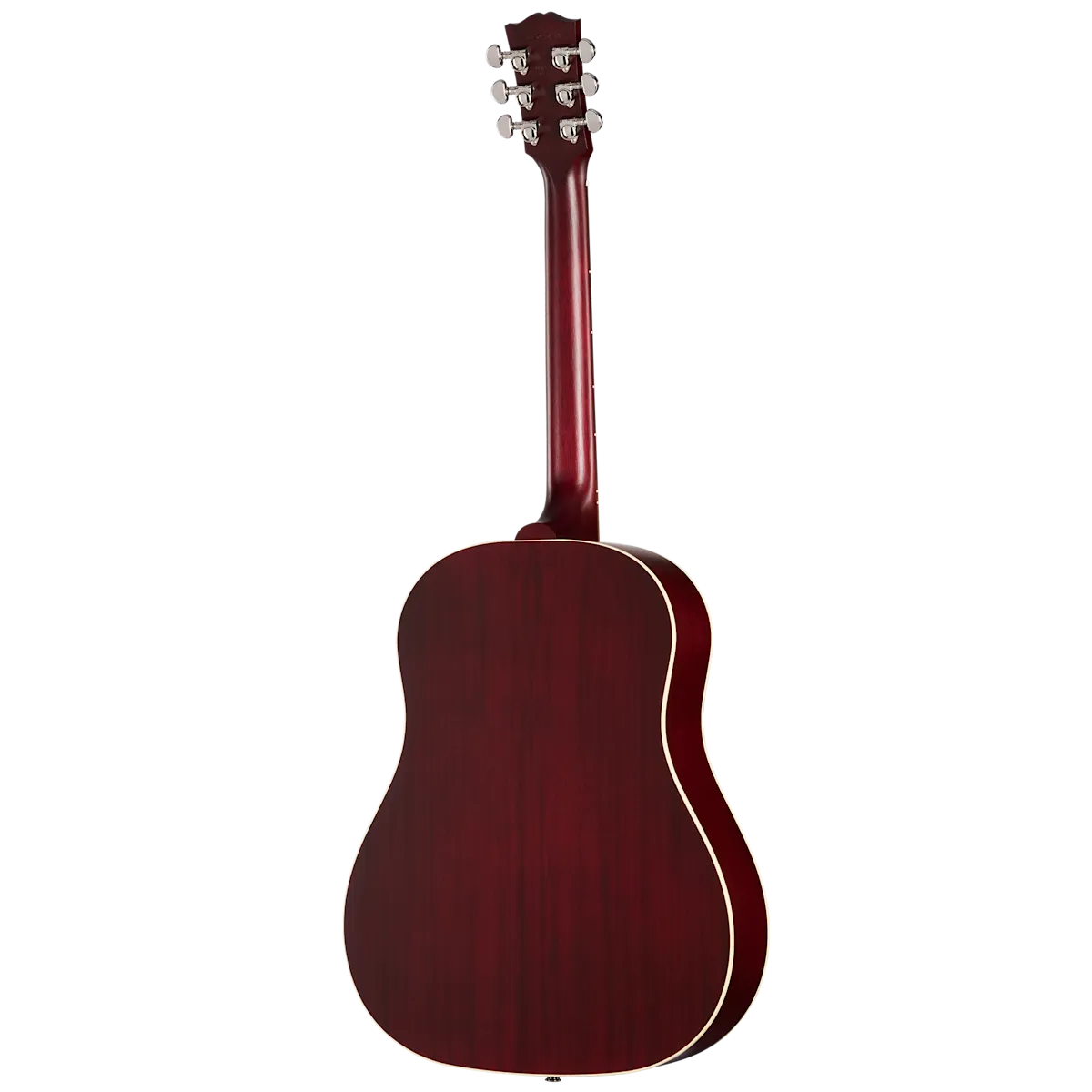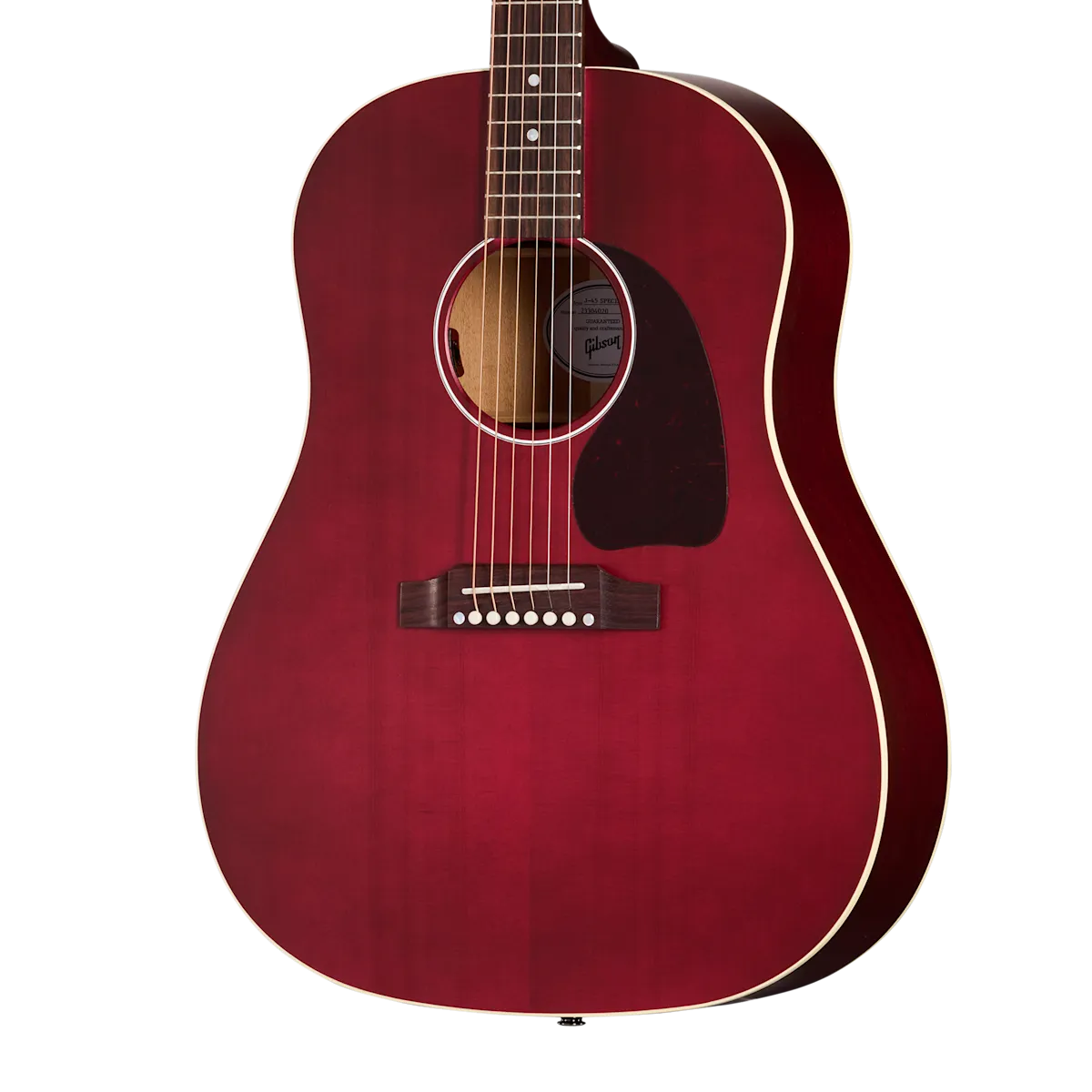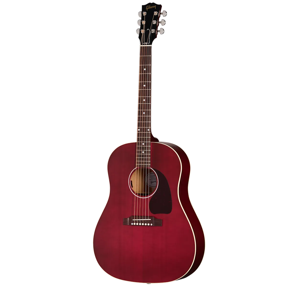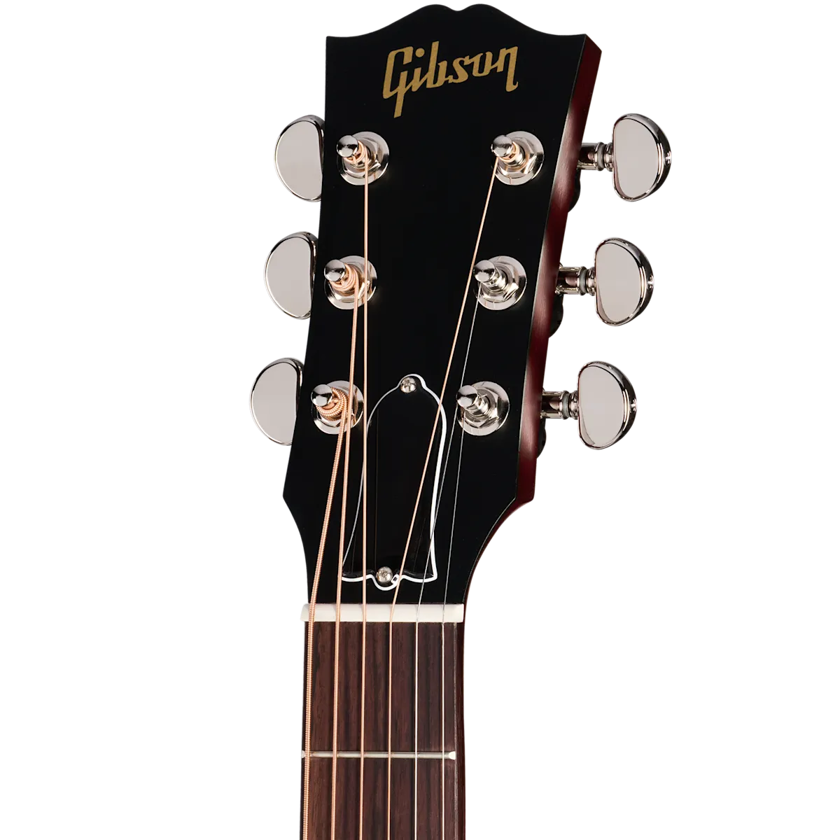 First introduced in 1942, the Gibson J-45™ has remained a mainstay Gibson acoustic model. It has earned its name as “The Workhorse” due to its wide acceptance, no-nonsense simplicity, and understated elegance. It’s one of the most recorded acoustic guitars in history and Gibson’s best-selling acoustic model of all time. Handcrafted with care in Bozeman, Montana, by Gibson’s expert acoustic luthiers, the new Gibson J-45 Special offers players a USA-built Gibson acoustic guitar at a very attractive price. The J-45 Special has a round shoulder body constructed using genuine solid mahogany for the back and sides and a solid Sitka spruce top. The top is reinforced with our traditional scalloped X-bracing. This combination of tonewoods delivers a warm, balanced tone with excellent dynamic range that is great for any musical genre. The “concert depth” body is slightly thinner than on a J-45 Standard, giving the J-45 Special a leaner and tighter bass response that sits perfectly in the mix and also makes it easier to hold. The utile neck is attached to the body with a compound dovetail neck-to-body joint, and like all Gibson acoustic guitars, it is affixed with hot hide glue. The neck has a comfortable and fast-playing SlimTaper™ profile, and the rosewood fretboard has a 12” radius and is adorned with simple mother-of-pearl dot inlays and is fitted with 20 standard frets. The traditional belly-up rosewood bridge is equipped with a TUSQ® saddle, and the nut and bridge pins are also TUSQ. High-quality Grover® Rotomatic® tuners ensure solid tuning stability. The J-45 Special is finished in satin nitrocellulose lacquer in your choice of Satin Vintage Sunburst or Satin Wine Red. It comes with an L.R. Baggs Element Bronze under-saddle piezo pickup with active electronics and an easily accessible soundhole-mounted volume control pre-installed for studio-quality plug-and-play anywhere. The J-45 Special also comes with a premium soft shell case.