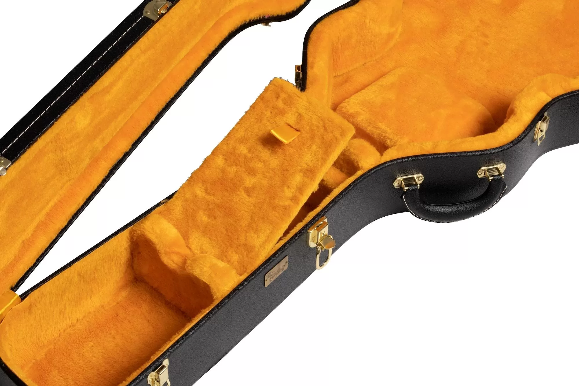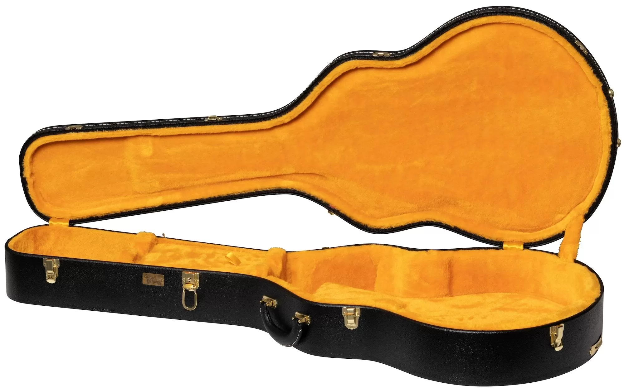 Since 1918, Lifton™ has been acclaimed worldwide for fine leather goods and musical instrument cases that are as synonymous with Gibson as the instruments inside of them. Lifton continues that tradition of excellence today with our Lifton Historic Hardshell Cases. Inspired by the iconic cases from the 50s and 60s that were made during the height of Gibson's Golden Era, they feature classic styling and are designed to provide a lifetime of protection for your prized Gibson guitar. Designed to fit: 60s ES Models (specifically 60s ES-335, ES-355s, and Trini Lopez models, but will fit other EST models such as ES-330, ES-345, & Lucille) Exterior: Black Pebble Tolex Interior: Goldenrod Plush Historic D-shaped handle Historic style latches with one locking latch Accessory compartment with ribbon pulltab Internal dimensions: 43 7/8" total interior length, 23 3/8" body length, 11 1/4" upper bout width, 9 1/2" waist width, 15 5/8" lower bout width, 3 1/2" depth.