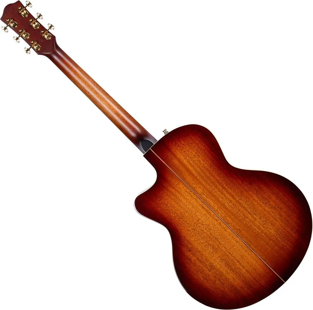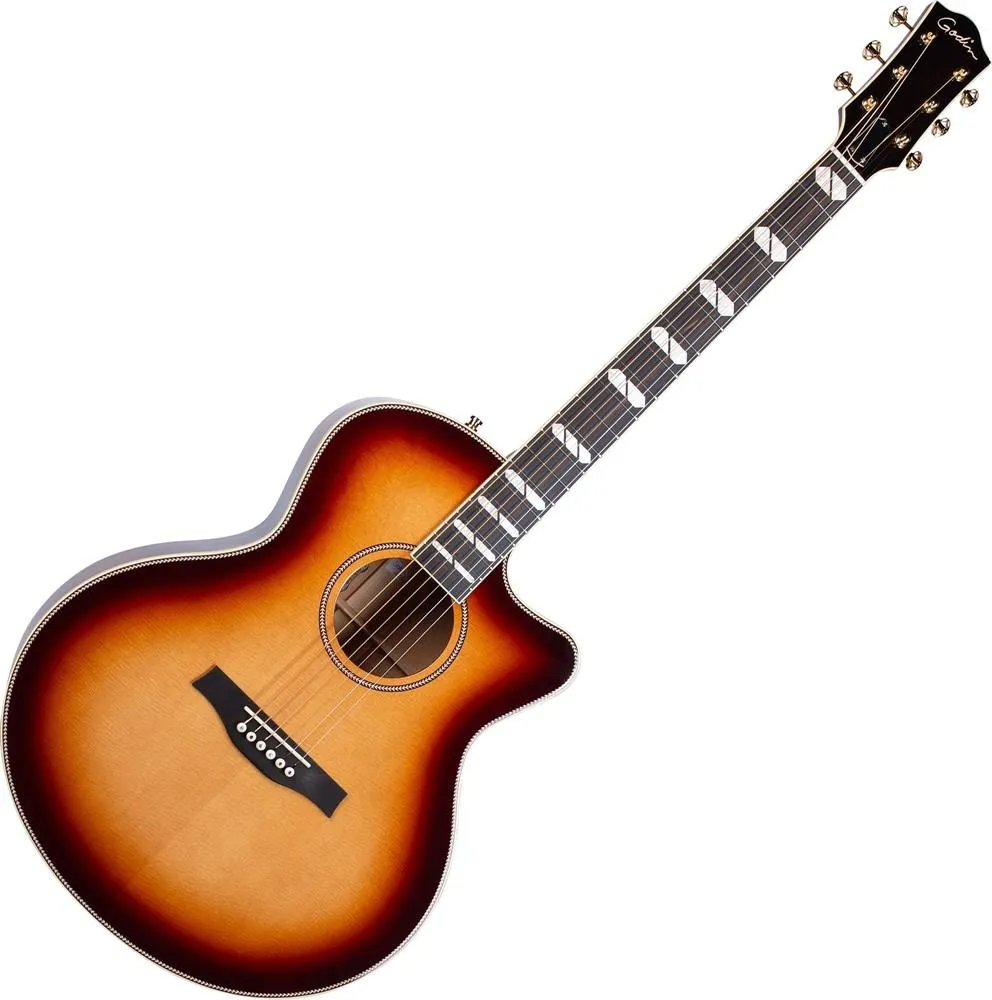 The Godin Connaisseur MJ Sunsetburst Maho is a premium Canadian minijumbo acousticelectric guitar that blends fine craftsmanship with deep acoustic tone and modern amplified versatility. It boasts a solid spruce top with solid mahogany back and sides for warm resonance and balanced sound projection. A mahogany neck with ebony fingerboard provides smooth playability, while the LR Baggs HiFi preamp system delivers rich, nuanced amplified tone. Its highgloss Sunset Burst finish gives classic visual appeal.