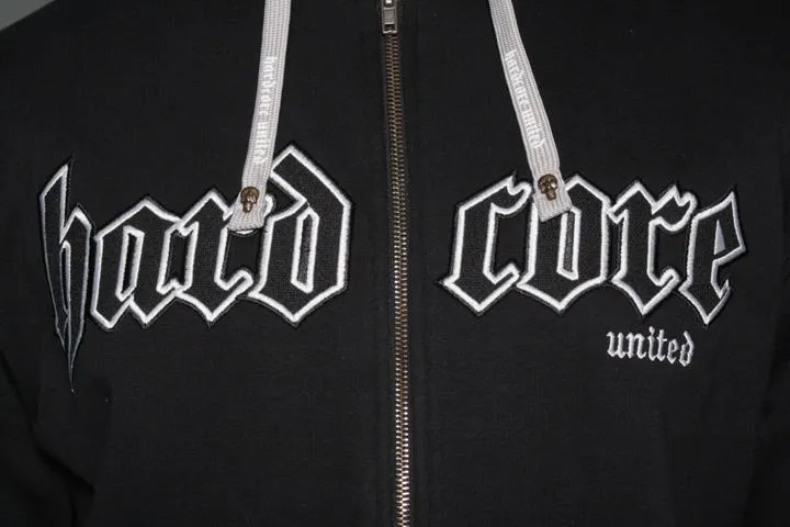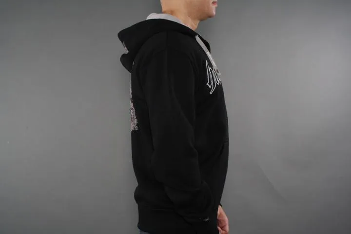 Cool sweatshirt with hood and zipper. Embroidery on the chest, print on the back and branding on the hood. 80% cotton, 20% polyester. Men's, black, XL.