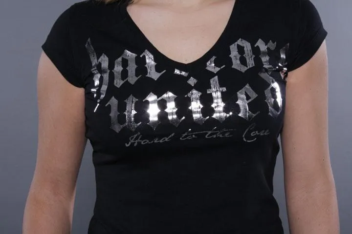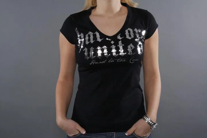 Short sleeve t-shirt with deep v-neck. Hardcore logo in silver printed on the chest. 100% cotton. Ladies, black, XL.