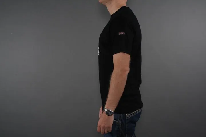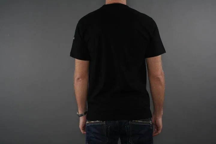 Short sleeve t-shirt with print on the chest. Small hardcore mark on one sleeve. 100% cotton. Men, black, XL.