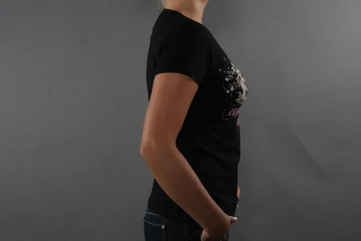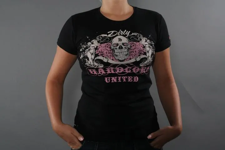 Large print on the chest. 2 metal skulls + Hardcore United on right waist. 95% cotton, 5% elastane. Women's, black, small.