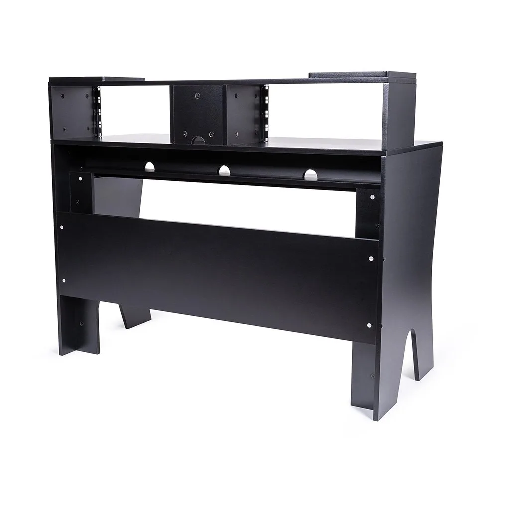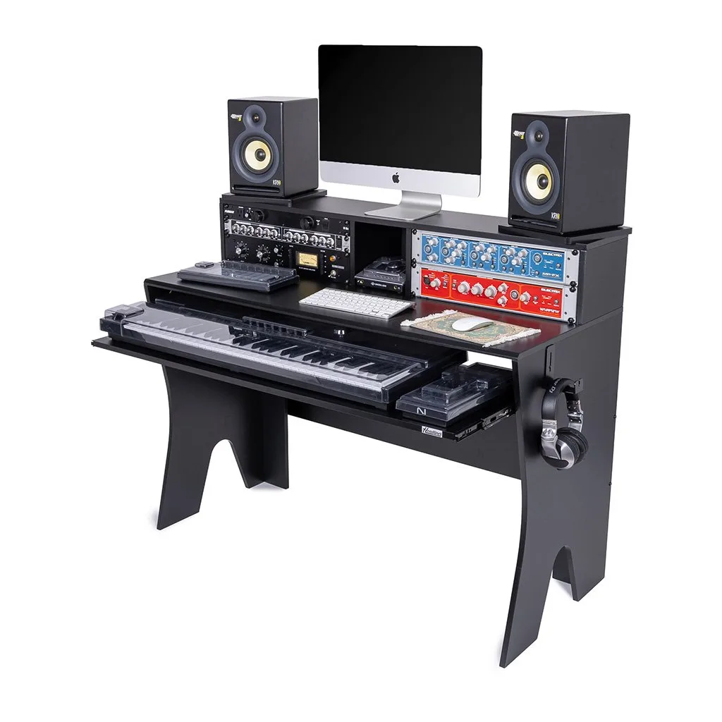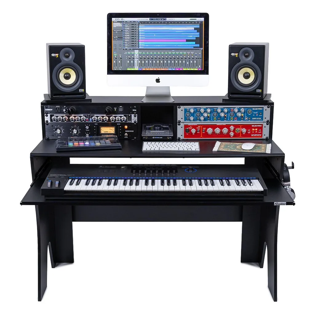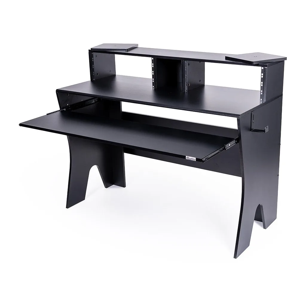 The main work surface provides a comfortable area for laptops, controllers, and editing tasks. A slide-out keyboard tray accommodates full-size 61-note MIDI controllers and offers three adjustable height positions for optimal ergonomics.