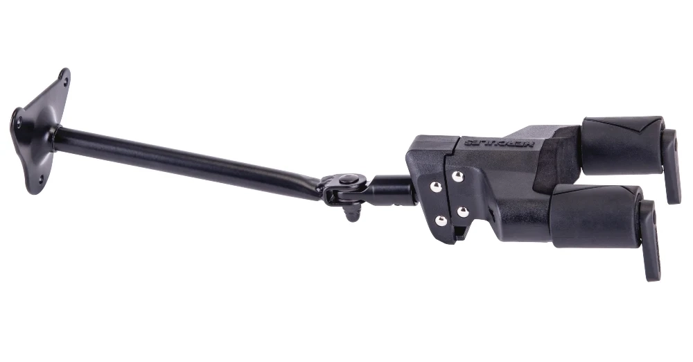 Stable and secure guitar mount with long, angle-adjustable arm for wall mounting.