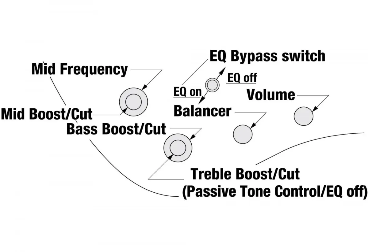 • EQ bypass switch (passive tone control on treble pot).