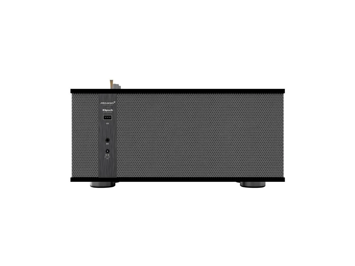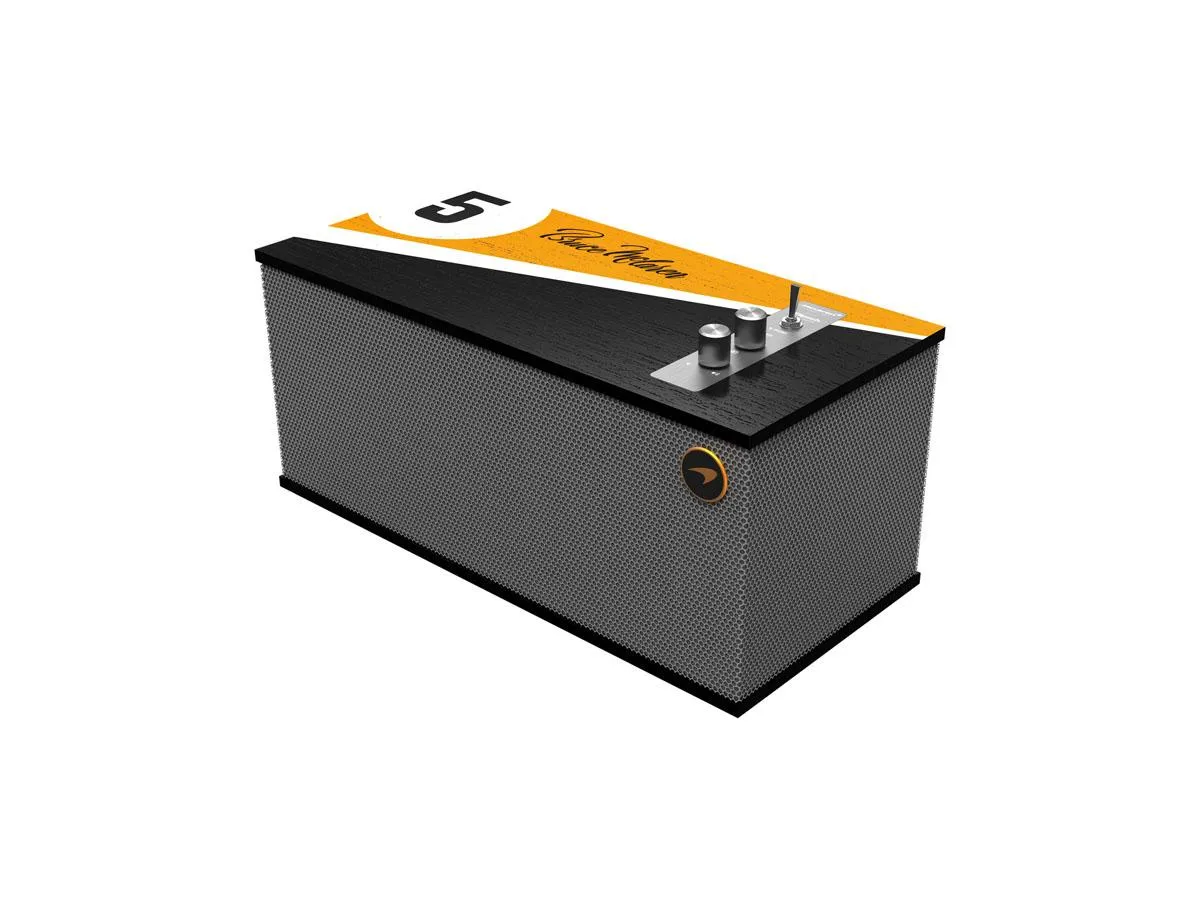 This special edition of The One II wireless speaker is designed in partnership with Klipsch and McLaren Racing. The top of the speaker prominently features graphics with the signature McLaren papaya color and #5, which is the number of the car in which Bruce McLaren won his first race. The remainder of the cabinet offers a walnut/black finish, and sports a premium metal grille to complete the automotive aesthetic.
