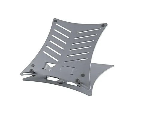 Attractive and appealing laptop stand with gray powder coating. The shapely base plate is made of steel, the support plate is made of aluminum. Due to the useful toothed hinge, the laptop stand is adjustable in tilt, offers maximum visual comfort and is set up or folded in no time. The package is very flat and with the optional carrying bag 12199 perfectly suited for the mobile DJ and musician. Individually adjustable stop pins with rubber caps allow the use of all common laptop models, mixers, CD players, etc. Protective support pads and anti-slip rubber feet are included.