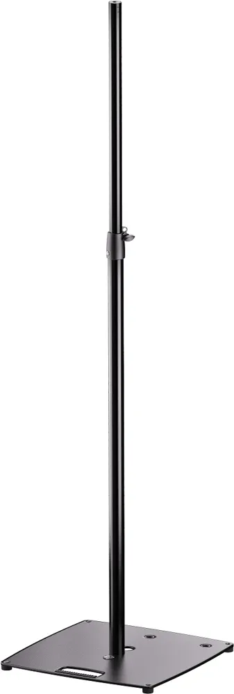Attractive stand for lights and smaller speaker cabinets. Thanks to the heavy, flat steel plate, the stand is suitable for use where space is at a premium. Depending on requirements, there are three ways to position the distance rod. In addition to the centered and off-center position, the tube combination can also be mounted in the corner. A carrying handle, a cable management and four sturdy feet are further useful features. The height is fixed with a safety hook and secured with a low-noise, backlash-free clamping screw. The slim design of the clamp enables space-saving transportation and ensures a stylish appearance. The usable height is between 1,400 and 2,400 mm and can be reached in 5 steps of 200 mm. The integrated M10 threaded bush enables the attachment of a crossbar or the direct attachment of lights. The maximum load capacity with centric loading in the middle position is 20 kg.