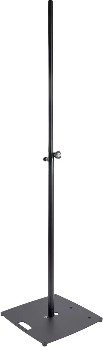 Attractive stand for lights and loudspeaker cabinets. Thanks to the heavy, flat steel plate (550 x 550 mm), the stand is ideal for use where space is at a premium. Depending on requirements, there are three ways to position the pole. In addition to the centric and off-center position, the tube combination can also be mounted in the corner. A carrying handle, a cable management system and four stable feet are further useful features. The usable height is between 1,420 and 2,420 mm and can be reached in 5 steps of 200 mm. The tried and tested K&M clamping screw and the robust locking bolt are used for fixing. The integrated M10 threaded bush enables the attachment of a truss or the direct attachment of lights. The maximum centric load capacity with full extension is 30 kg.