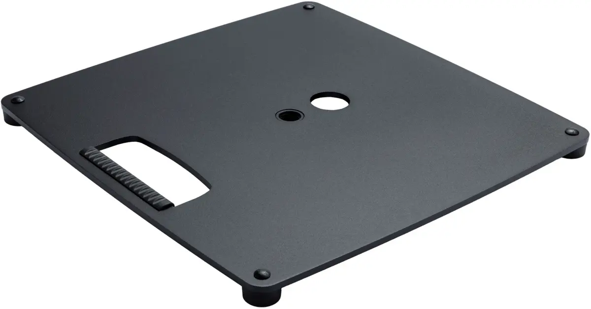 Heavy and solid base plate for all standard distance rods and rod combinations with M20 threaded bolts. An ergonomic carrying handle, a cable management and four sturdy rubber feet are further useful features. The dimensions are 406 x 406 mm, with a weight of 7.4 kg.