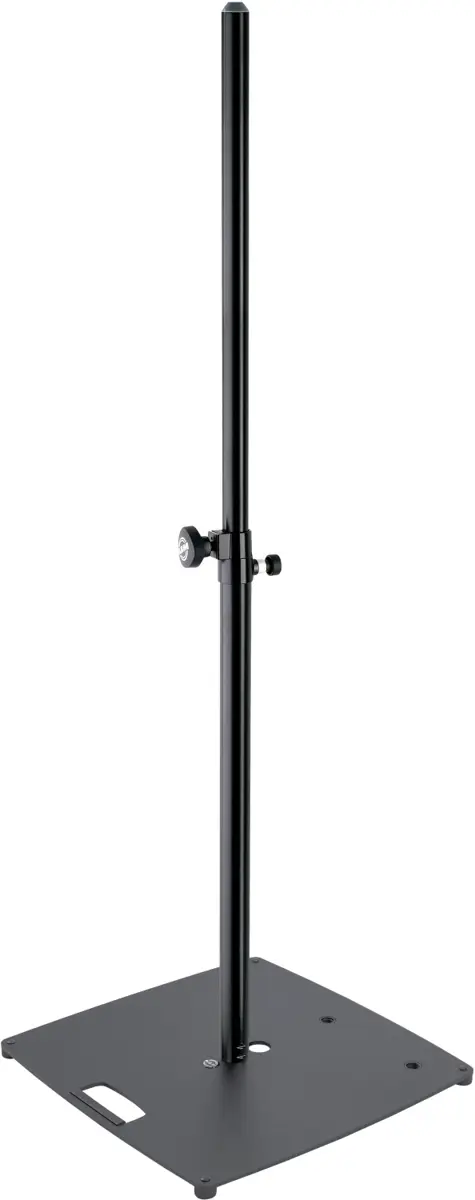 Our strongest speaker stand with space-saving base plate. Thanks to the heavy, flat steel plate (550 x 550 mm), the stand is ideal for use where space is at a premium. Depending on requirements, there are three ways to position the pole. In addition to the centric and off-center position, the tube combination can also be mounted in the corner. A carrying handle, a cable management system and four stable feet are further useful features. The usable height is between 1,110 and 1,810 mm and can be reached in 4 steps of 175 mm. The tried and tested K&M clamping screw and the robust locking bolt are used for fixing. The maximum centric load capacity with full extension is 50 kg.